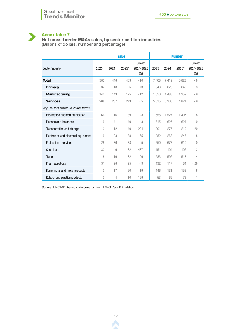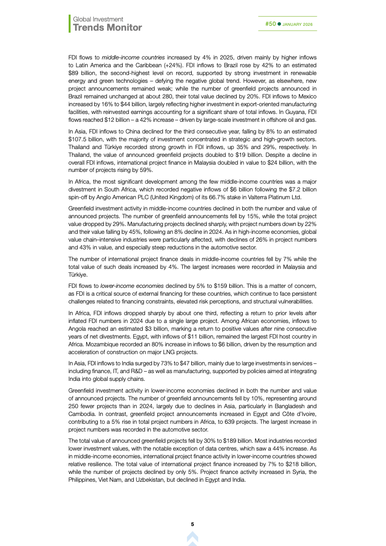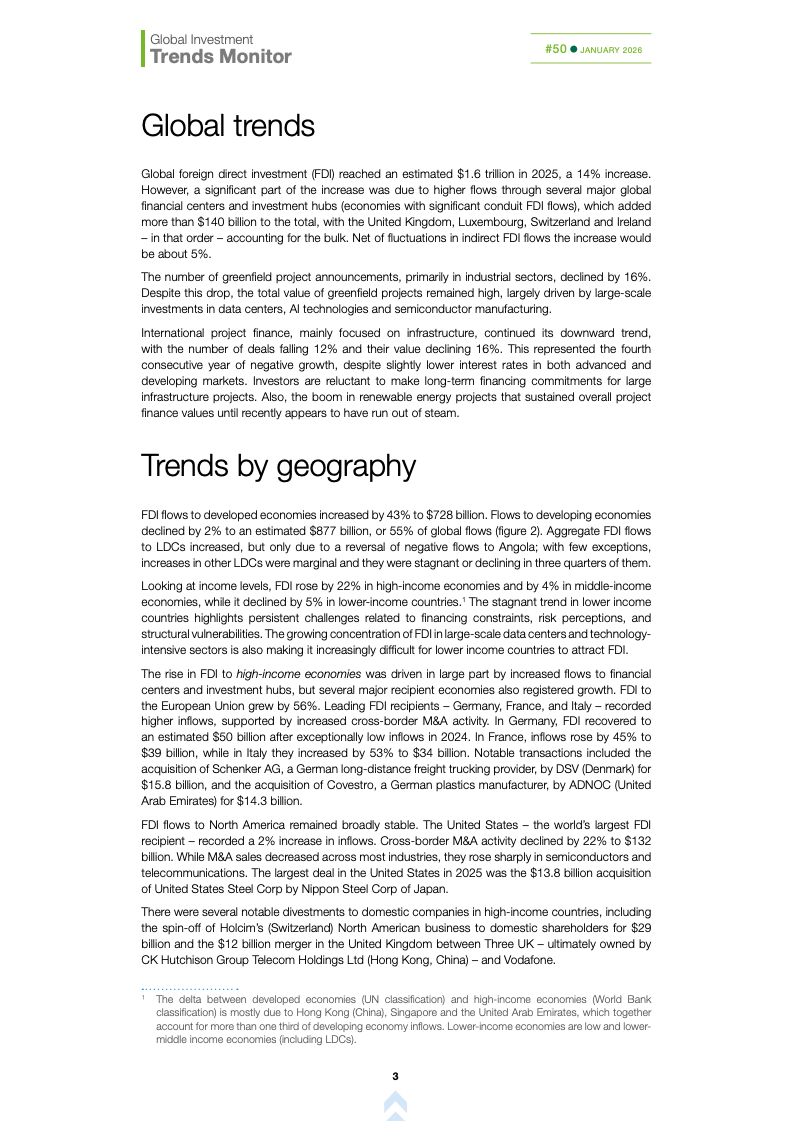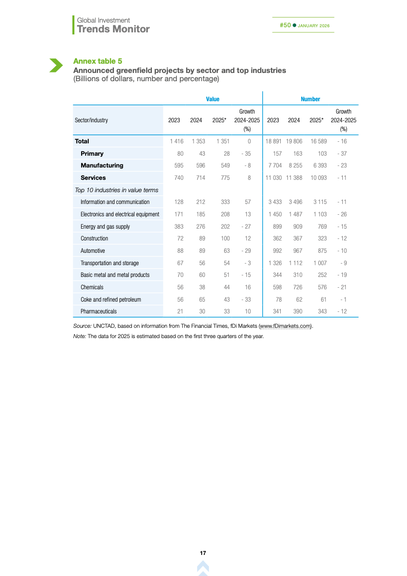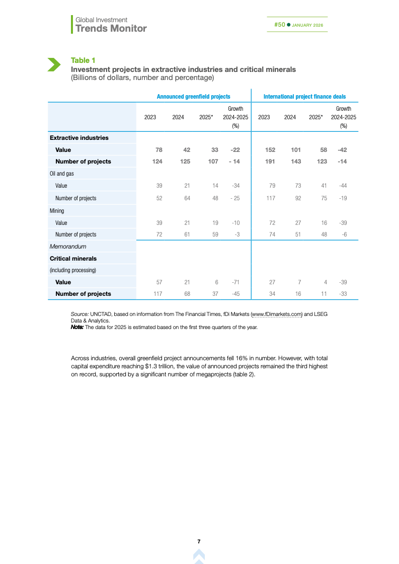 基础设施与能源转型投资持续承压。国际基础设施投资额下降10%,主要受可再生能源项目大幅萎缩影响,投资者正重新评估收益风险与监管环境。这加剧了高度依赖国际融资国家的发展缺口,可能制约全球能源转型进程,使新兴市场在长期基础建设竞争中处于不利地位。