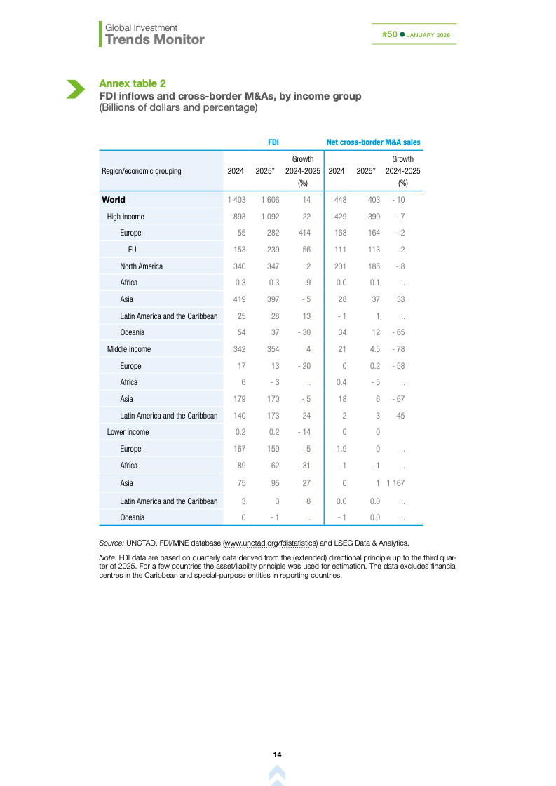 2025年全球外国直接投资录得1.6万亿美元,同比增长14%,终结了连续两年的低迷。然而,扣除全球金融中心约1400亿美元的通道性资金后,实际基础投资增长仅约5%。这反映出全球实体领域的长期投资复苏仍显乏力,增长动力主要源于金融层面的存量调整与资金流转。