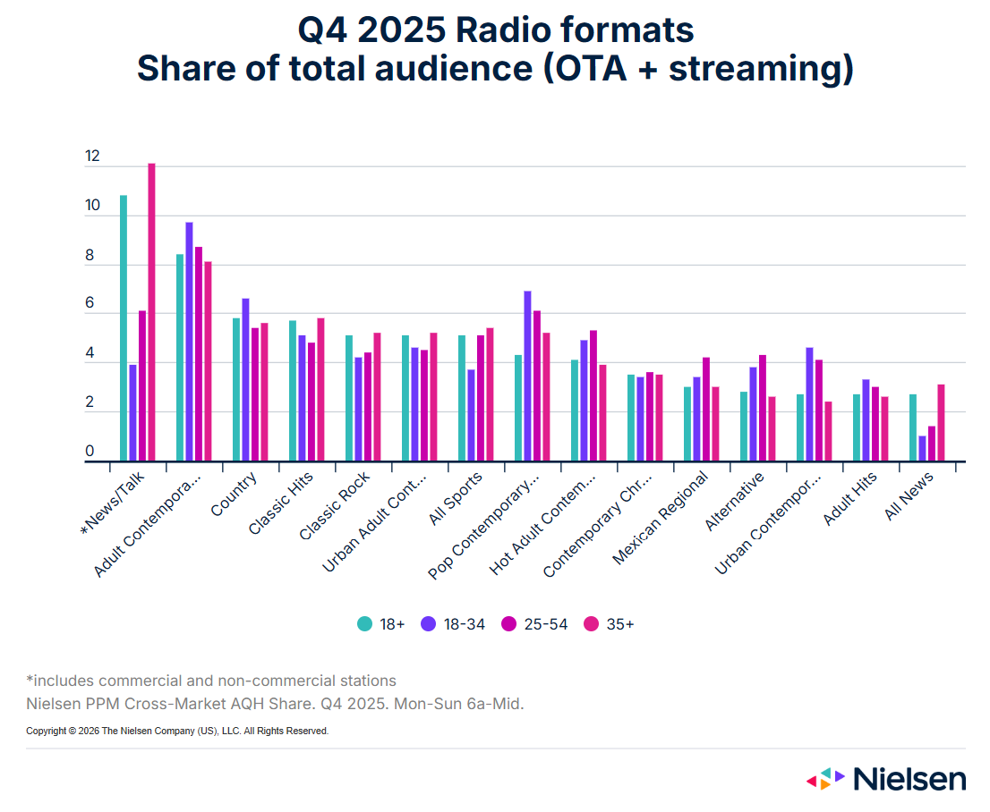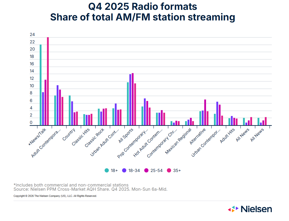 在包括广播、播客、流媒体音乐服务和卫星广播等广告支持和无广告平台中,消费者每天的音频收听时长总计为 3 小时 54 分钟。在 2025 年第四季度,广告支持音频占所有音频收听时长的 63%。