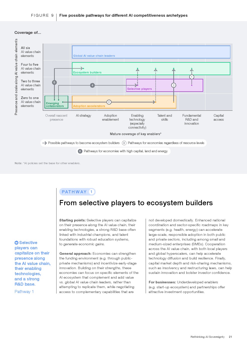 各经济体以不同的起点加入人工智能竞赛。虽然基于基础设施的人工智能主权对大多数经济体而言难以实现,但通往人工智能竞争力的路径多种多样。
