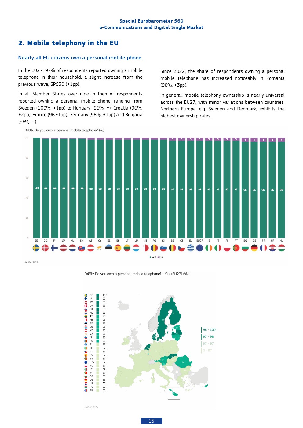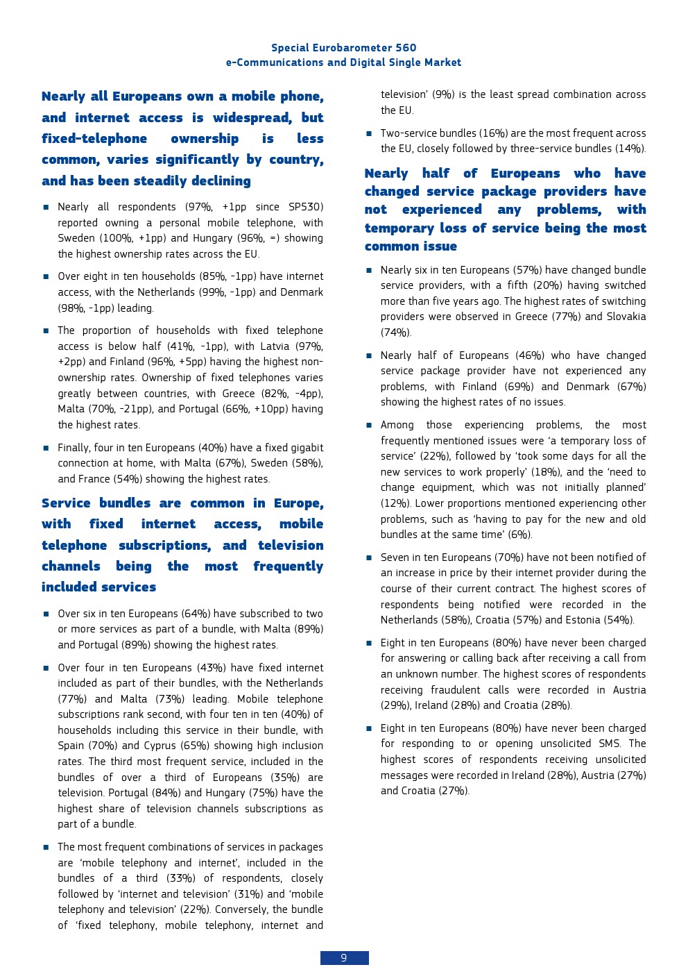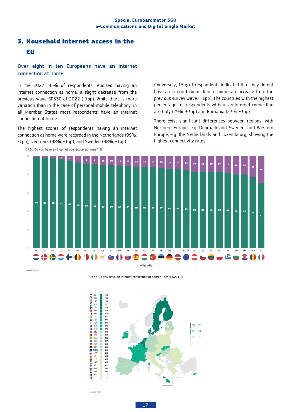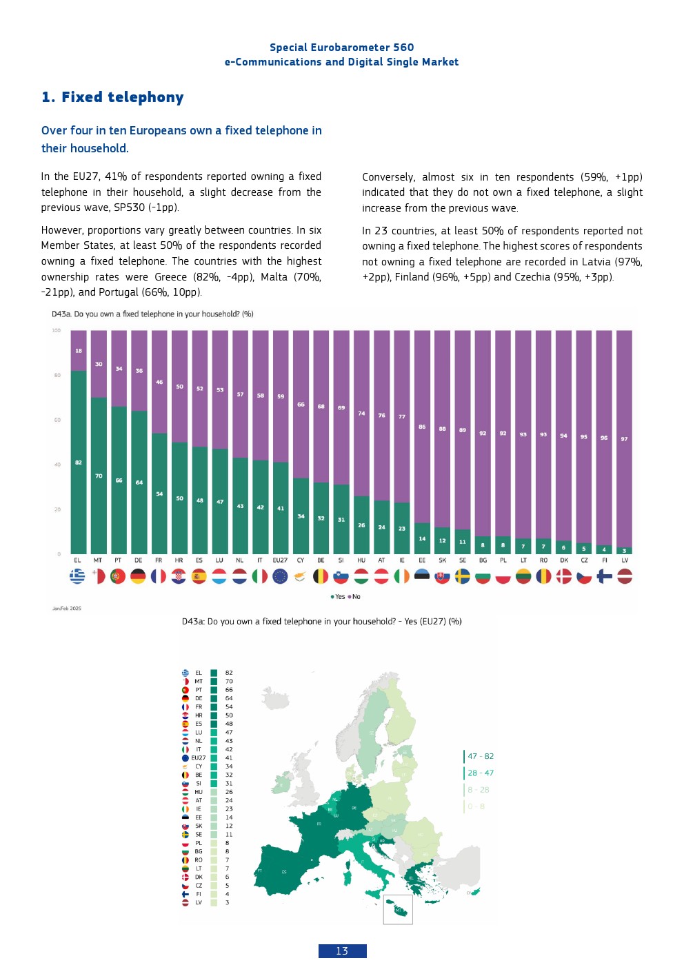 本报告基于2025年对欧盟27国26,354名受访者的调查,呈现出欧洲数字通信市场高度成熟但结构分化的特征。移动通信已实现近乎完全渗透,97%的个人拥有手机,而家庭互联网接入率为85%,显示基础数字接入已成为“准公共品”。相比之下,固定电话持有率仅为41%,并持续下降,反映出通信形态向移动化与互联网化的结构性替代趋势。