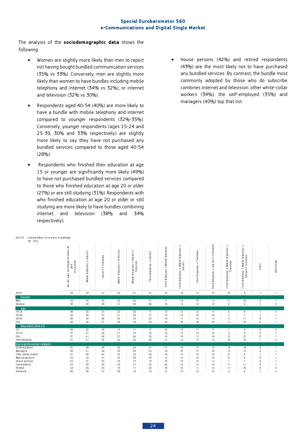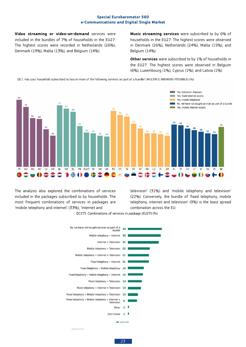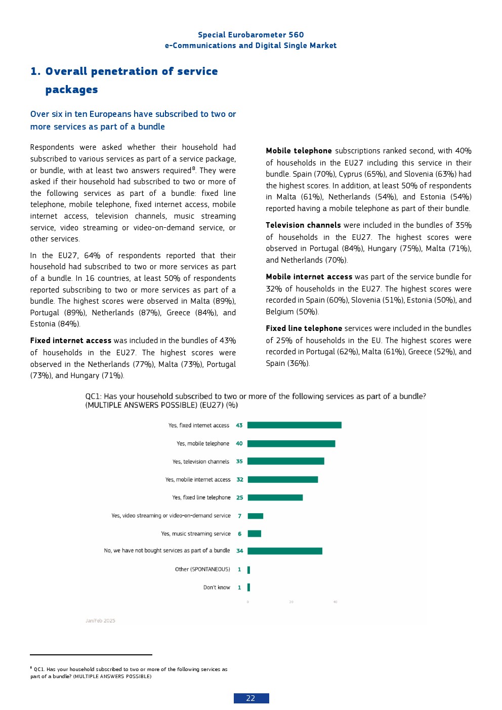 在商业模式层面,通信服务捆绑销售已成为主流。64%的欧洲家庭订阅至少两项服务组合,其中固定宽带(43%)、移动通信(40%)与电视服务(35%)构成核心三要素。最常见组合为“移动+互联网”(33%)和“互联网+电视”(31%),显示内容与连接的融合趋势。值得注意的是,仅9%的用户选择“四合一”全捆绑方案,表明消费者在便利与灵活之间仍保持权衡。