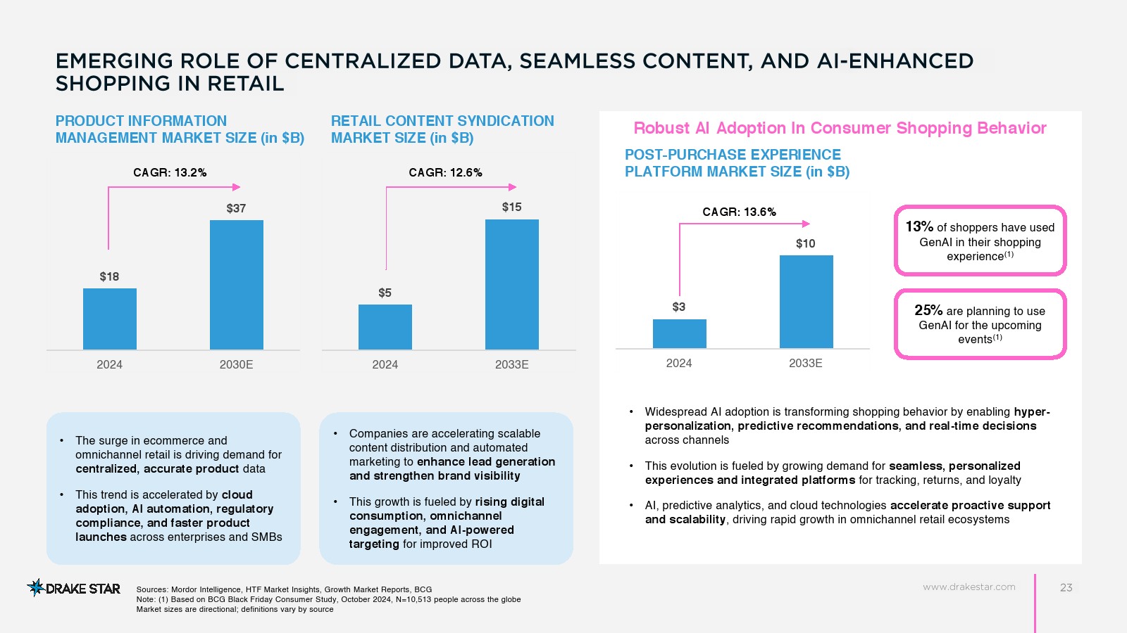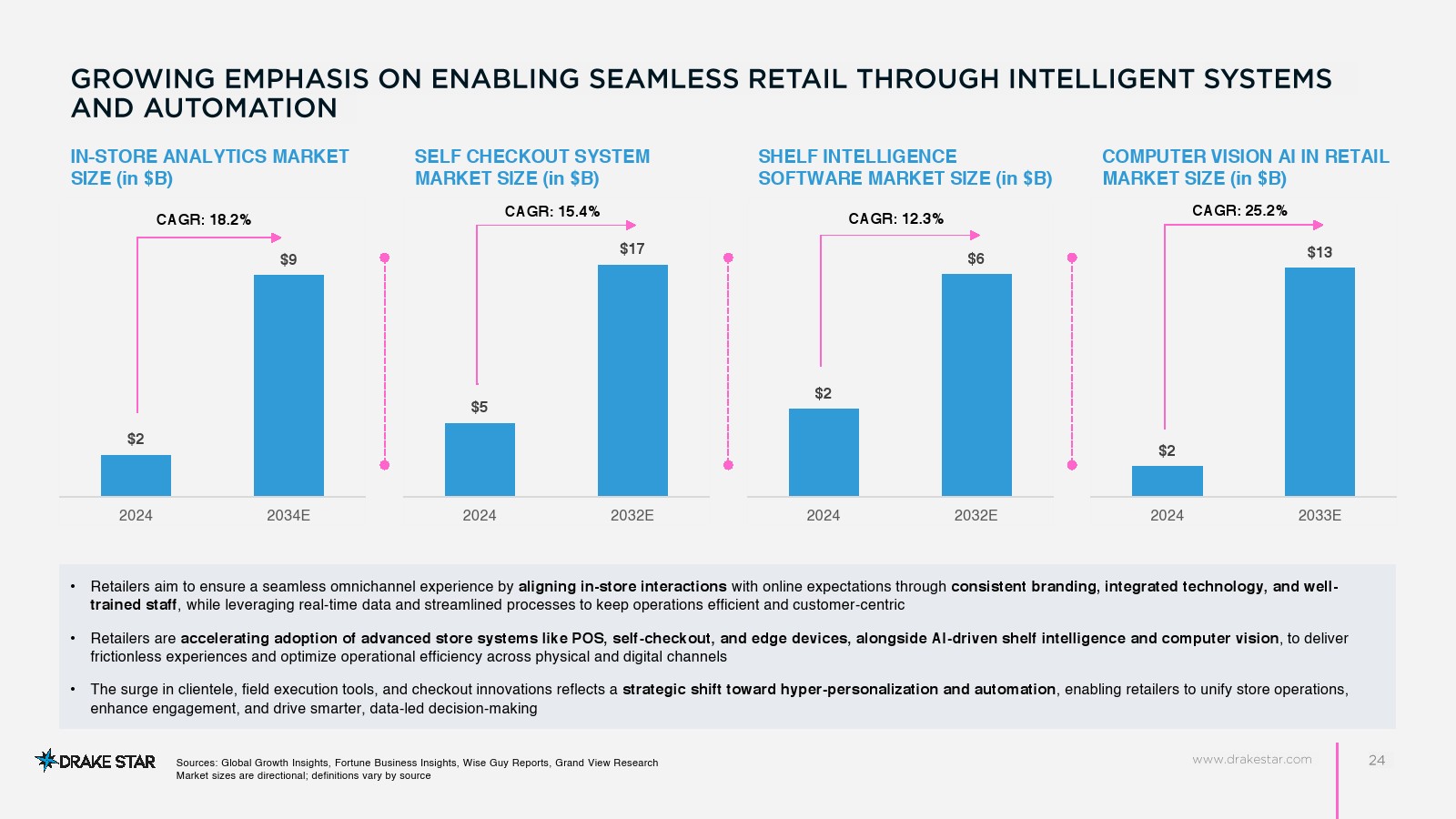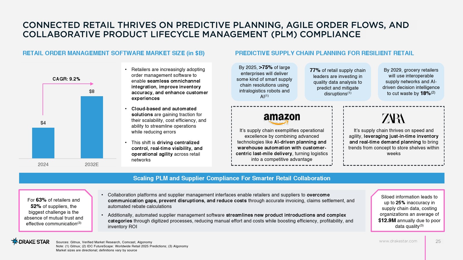 从细分赛道看,计算机视觉(25.2% CAGR)、门店分析(18.2% CAGR)及智能结算(15.4% CAGR)等领域增速显著 。供应链端,77%的企业加大数据投入以提升预测能力,而数据孤岛仍导致高达25%的信息误差,每年造成约1290万美元损失 。这进一步强化了“数据统一平台”的战略地位。