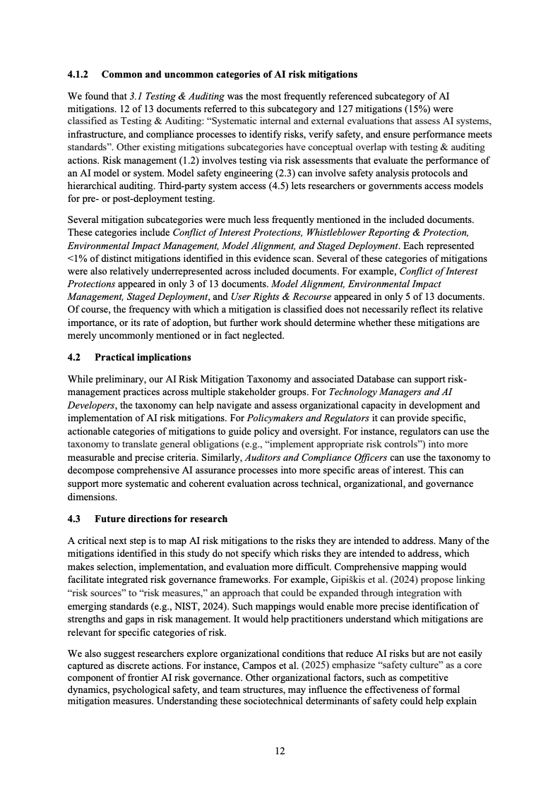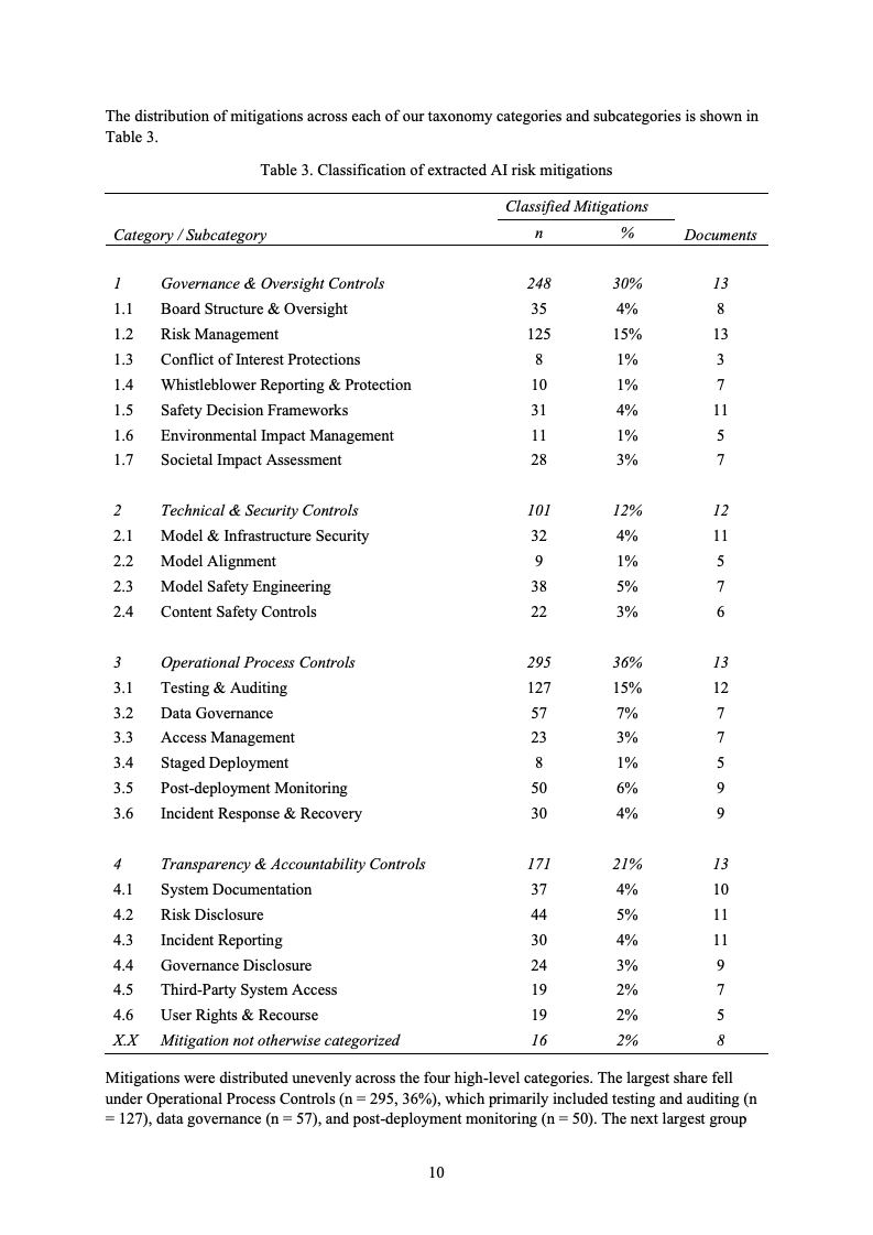 从整体结构看,831项缓释措施被归纳为四大类。运营流程类措施数量最多,占比36%,反映出当前AI风险管理更侧重于测试、审计、数据治理和部署后的持续监控。其中,仅“测试与审计”一项就涵盖127条措施,占全部样本的15%,表明在高不确定性技术环境中,事前和事中的验证机制被视为最直接、也最容易落地的风险控制手段。
