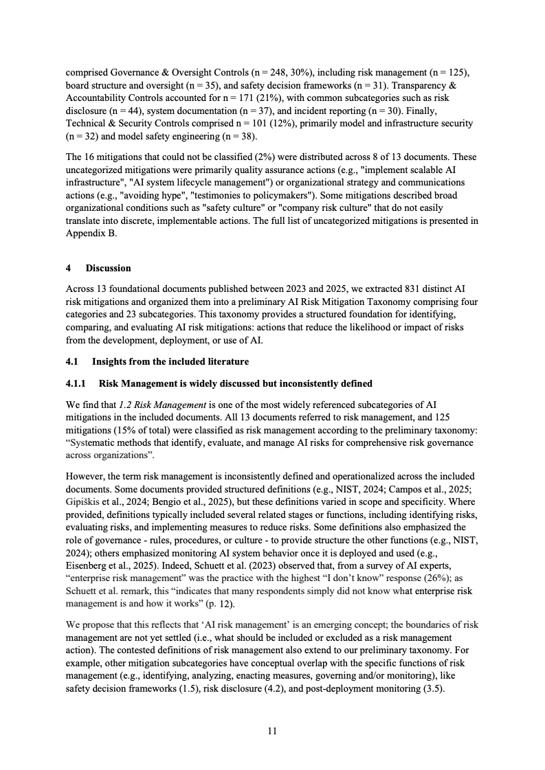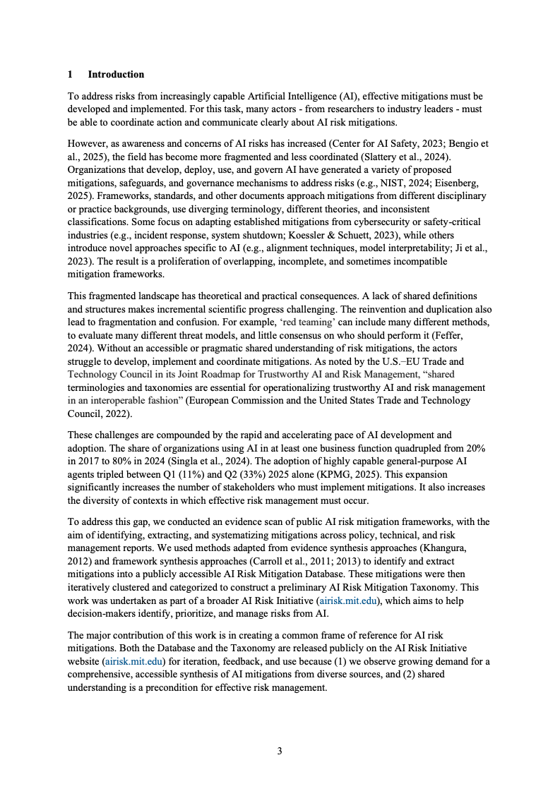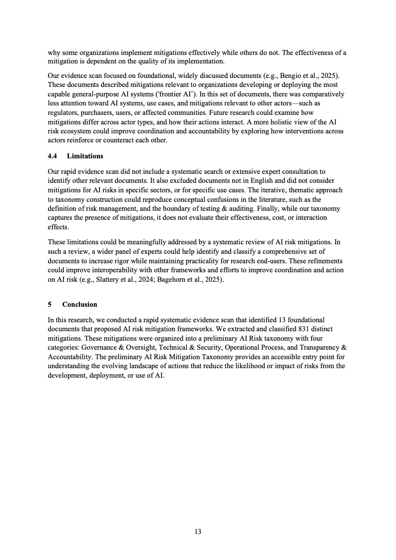 从趋势角度看,该研究揭示了一个清晰信号:AI风险缓释正在由“技术补丁式应对”转向“全生命周期、组织化治理”。未来,单一措施的堆叠将难以应对系统性风险,风险缓释与具体风险之间的映射、治理文化与激励机制的作用,以及跨主体协同,将成为决定AI安全治理成效的关键变量。