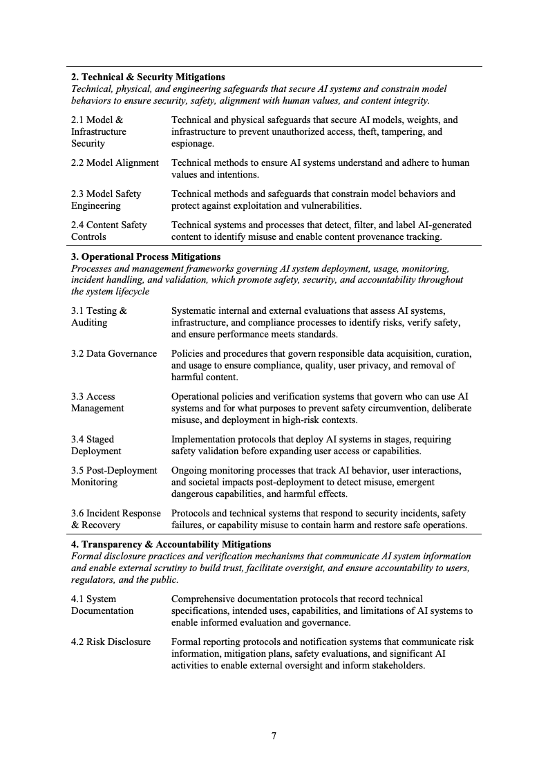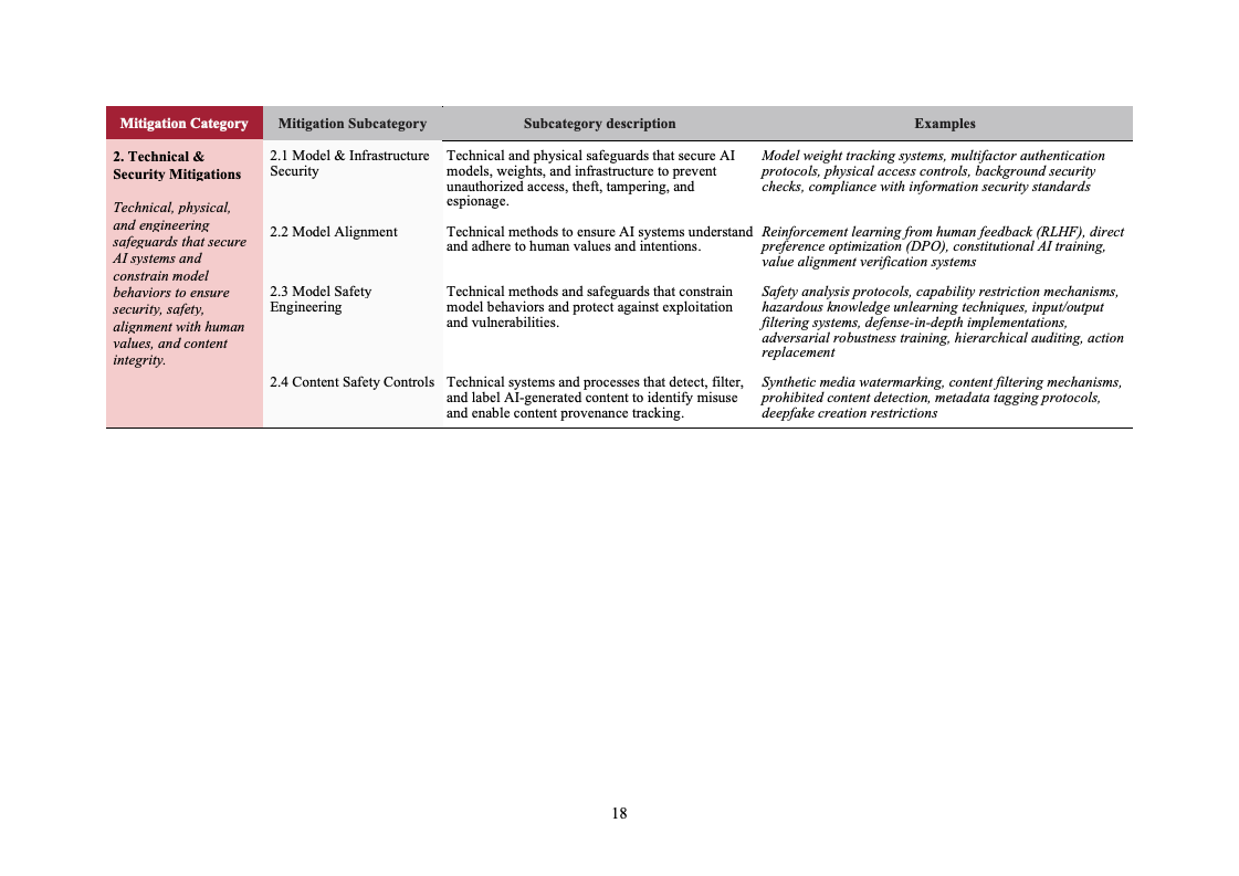 技术与安全类措施仅占12%,明显低于公众对“技术性解决方案”的直觉预期。模型安全工程和基础设施安全是主要组成部分,而真正与长期安全高度相关的“模型对齐”类措施仅占1%。这反映出现阶段技术社区在价值对齐与深层安全问题上,仍处于探索期,相关实践尚未规模化。