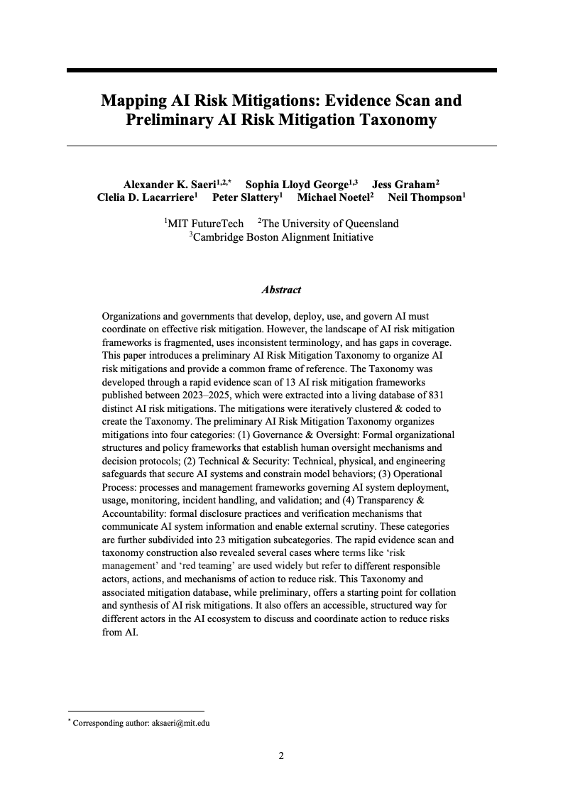 在人工智能能力快速提升并广泛应用的背景下,风险缓释措施已成为政府、企业与研究机构的共同议题。该研究通过对2023—2025年间13份核心AI风险缓释框架的证据扫描,系统提炼出831项具体缓释措施,并构建了一个初步的AI风险缓释分类体系,为分散且术语不统一的治理实践提供了共同参考框架。研究显示,AI治理正在从理念讨论阶段,逐步迈向可操作、可审计的制度化阶段。