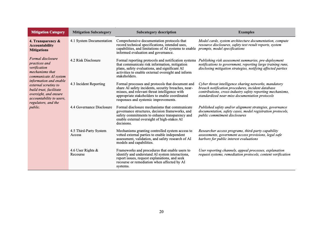 透明度与问责类措施占比21%,覆盖系统文档、风险披露、事故报告和第三方访问等内容。这一分布表明,随着监管趋严和社会关注度上升,AI系统的外部可审计性正在成为不可忽视的治理维度,但在用户权利与救济等方面,措施数量仍然有限。