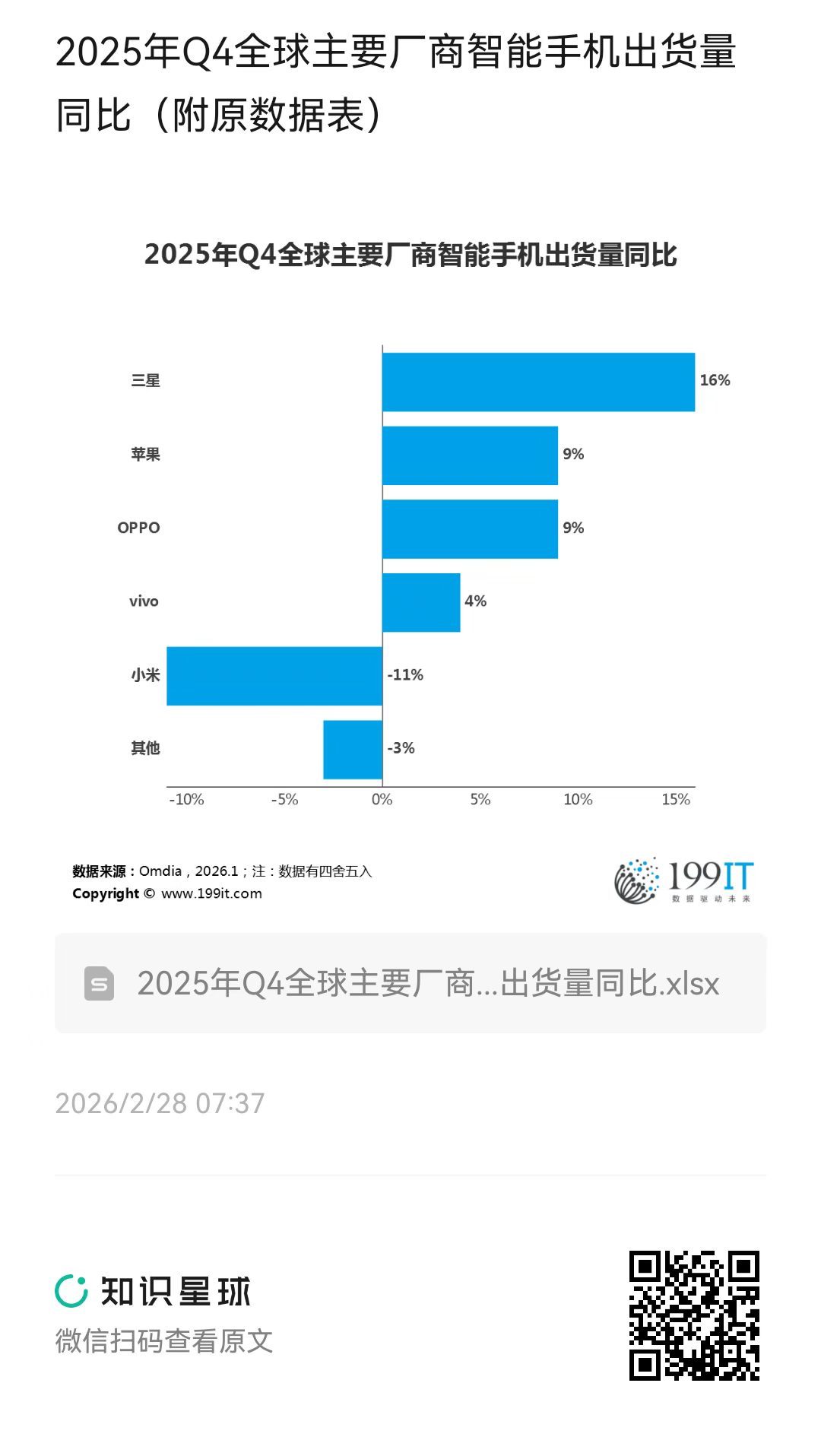 2025年Q4全球主要厂商智能手机出货量同比(附原数据表) ​​​