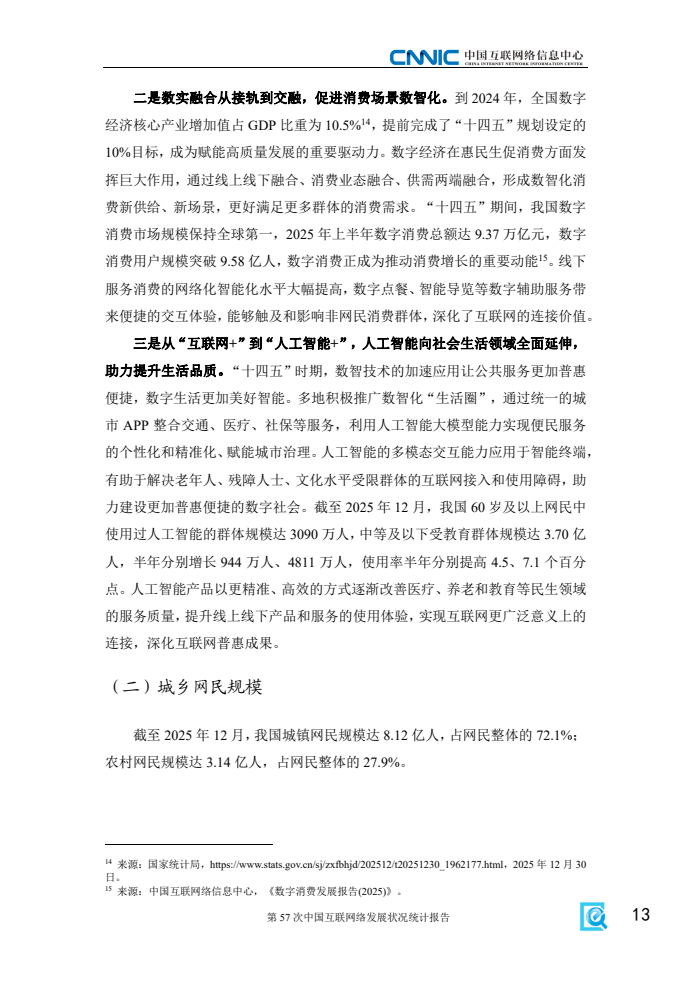 截至2025年12月,我国农村网民规模达3.14亿人,占网民整体的27.9%;城镇网民规模达 8.12亿人,占网民整体的 72.1%。