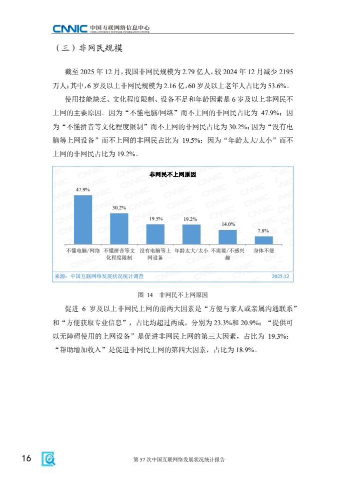 截至2025年12月,使用台式电脑、笔记本电脑、电视和平板电脑上网的比例分别为 32.5%、31.2%、23.5%和31.6%:使用智能家居设备和个人可穿戴设备上网的比例分别为 20.8%和 26.9%。