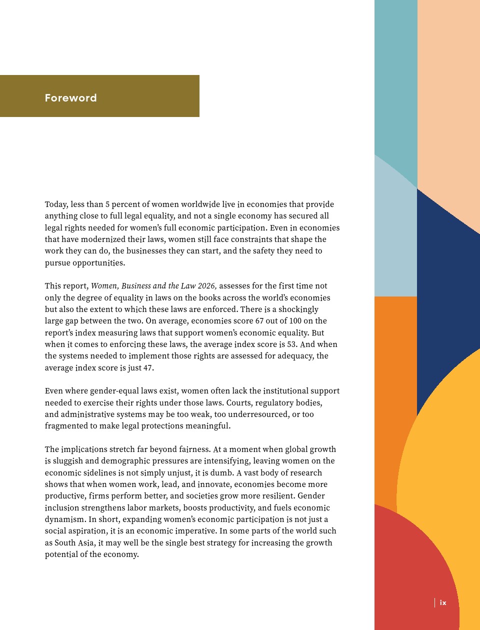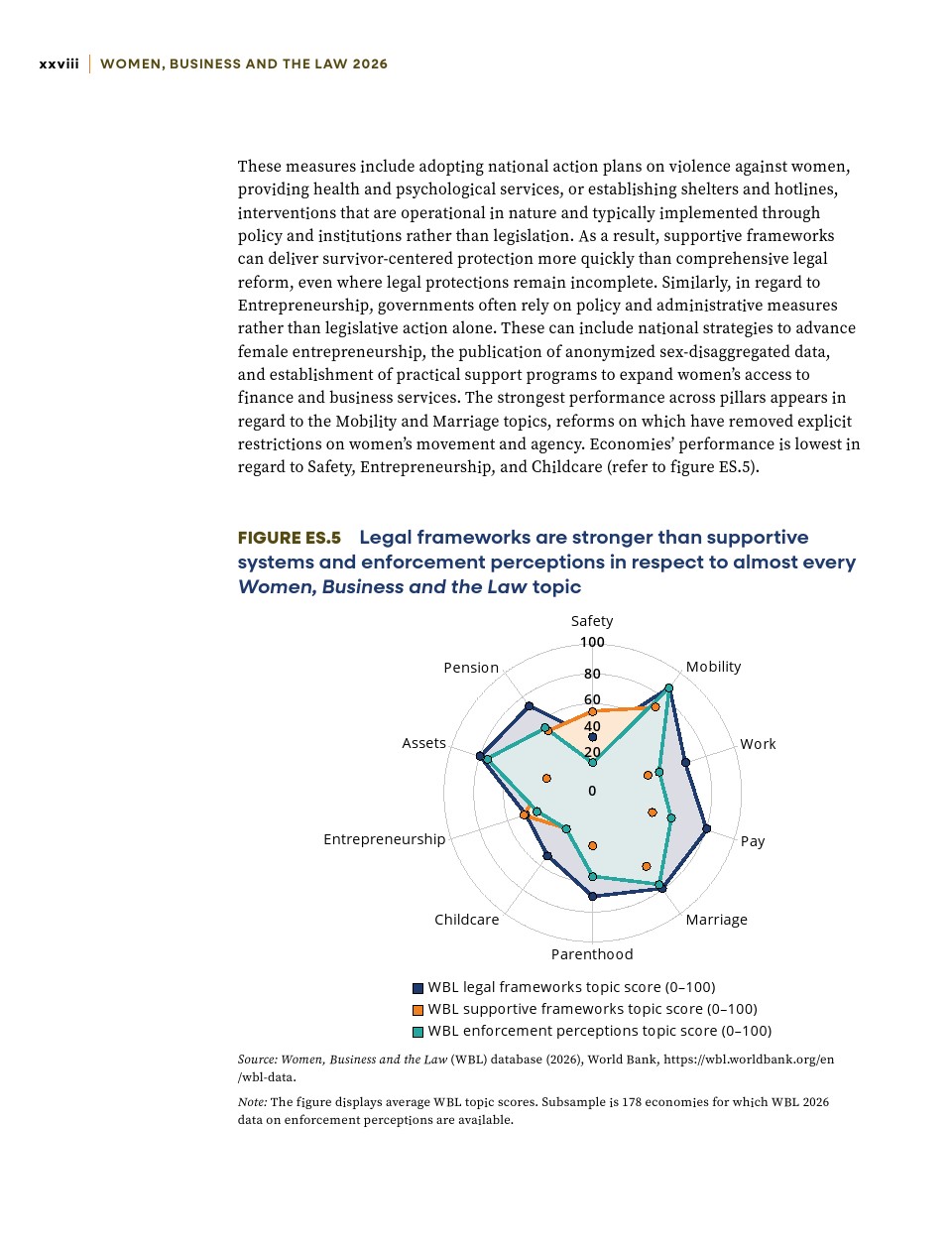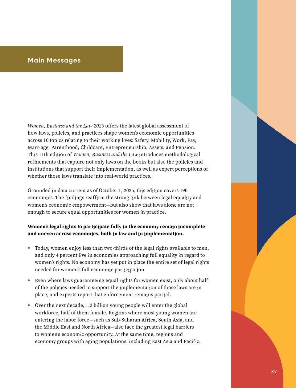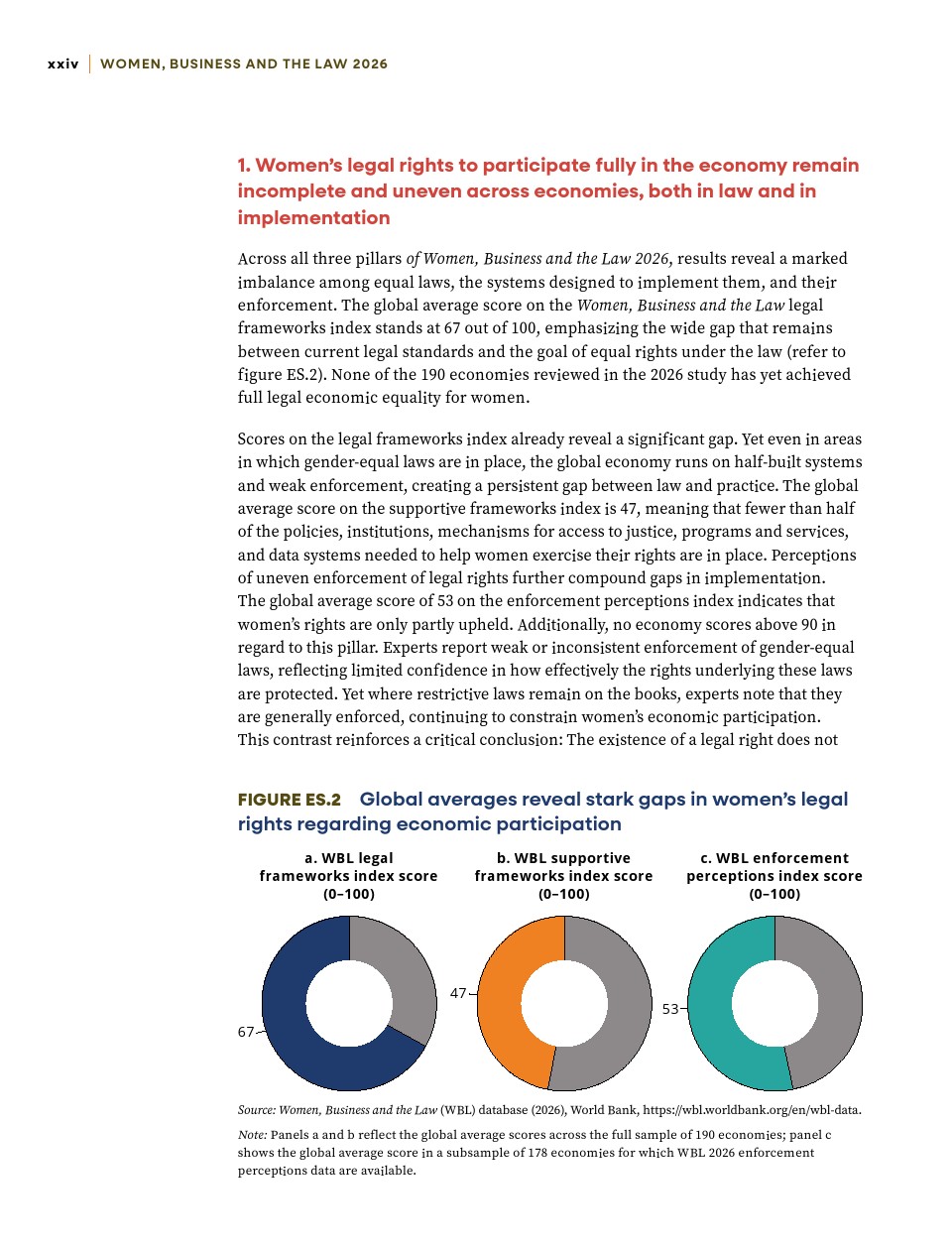 本报告基于190个经济体数据,首次系统性构建法律框架、支持体系与执行感知三大指标体系,对女性经济权利进行量化评估。数据显示,全球女性仅拥有不足三分之二的法定经济权利,接近完全平等的经济体占比不足5%,且尚无任何经济体实现完全法律平权。这一结构性缺口表明,制度性约束仍是限制女性经济参与的核心瓶颈。