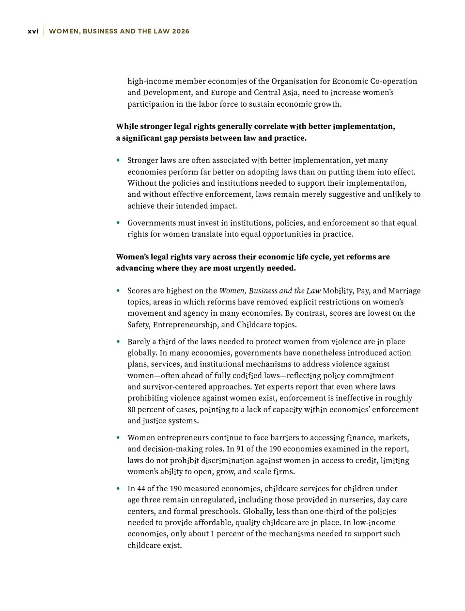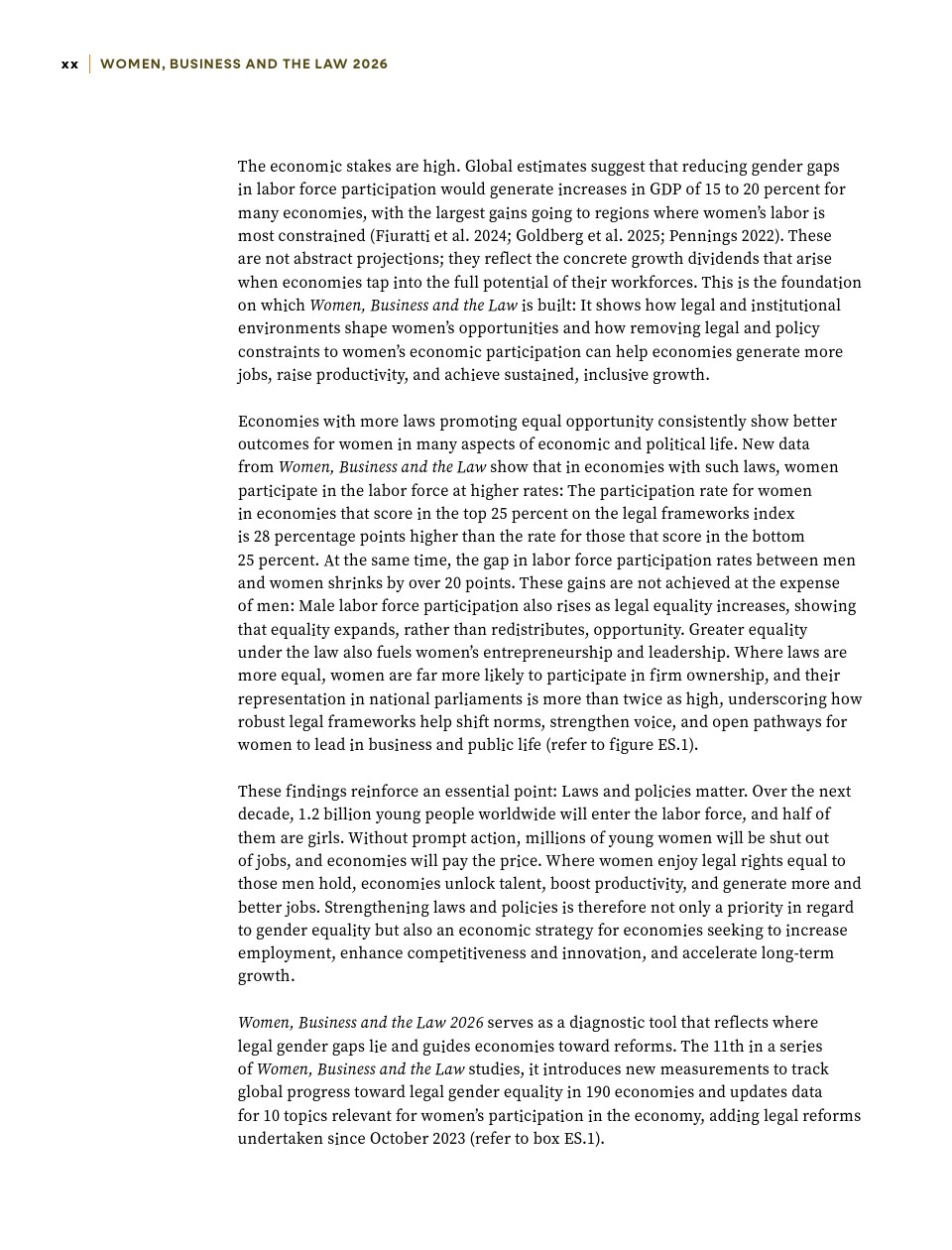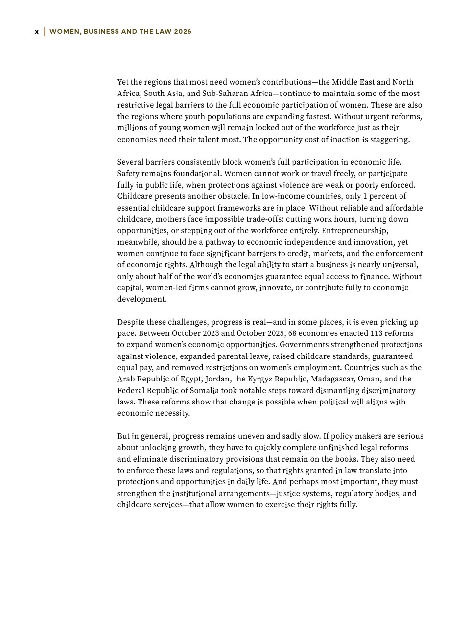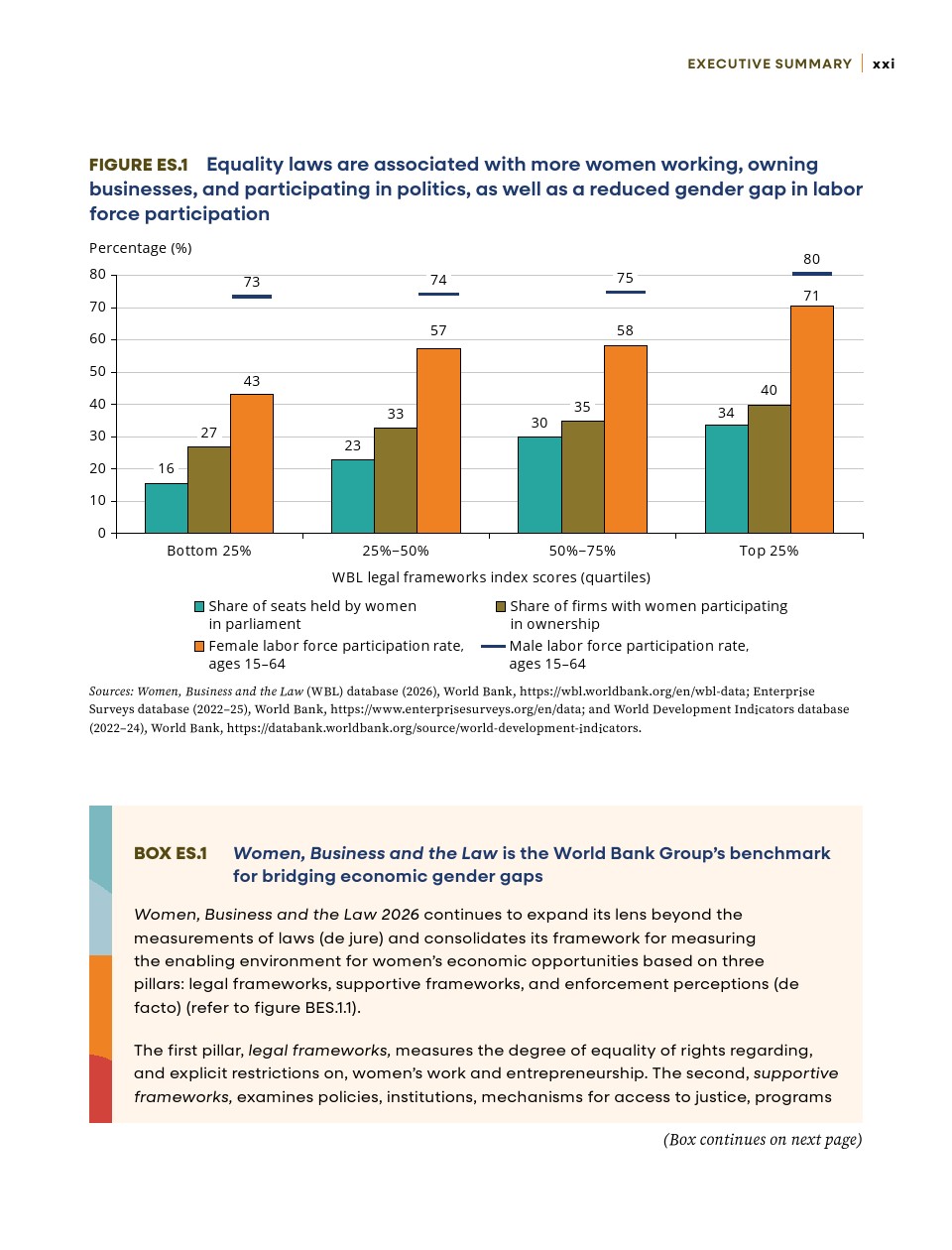 本报告基于190个经济体数据,首次系统性构建法律框架、支持体系与执行感知三大指标体系,对女性经济权利进行量化评估。数据显示,全球女性仅拥有不足三分之二的法定经济权利,接近完全平等的经济体占比不足5%,且尚无任何经济体实现完全法律平权。这一结构性缺口表明,制度性约束仍是限制女性经济参与的核心瓶颈。