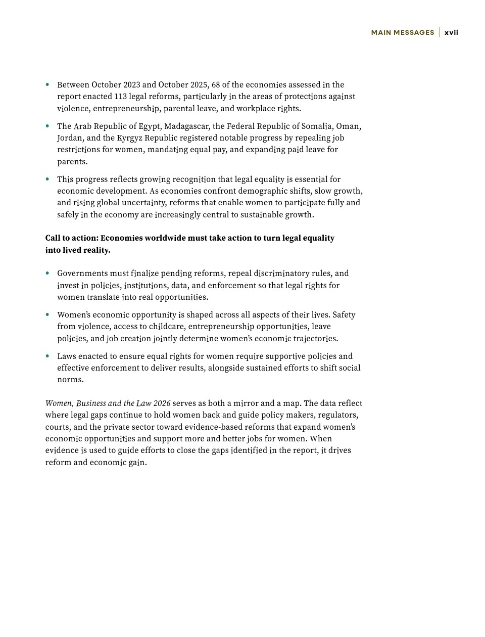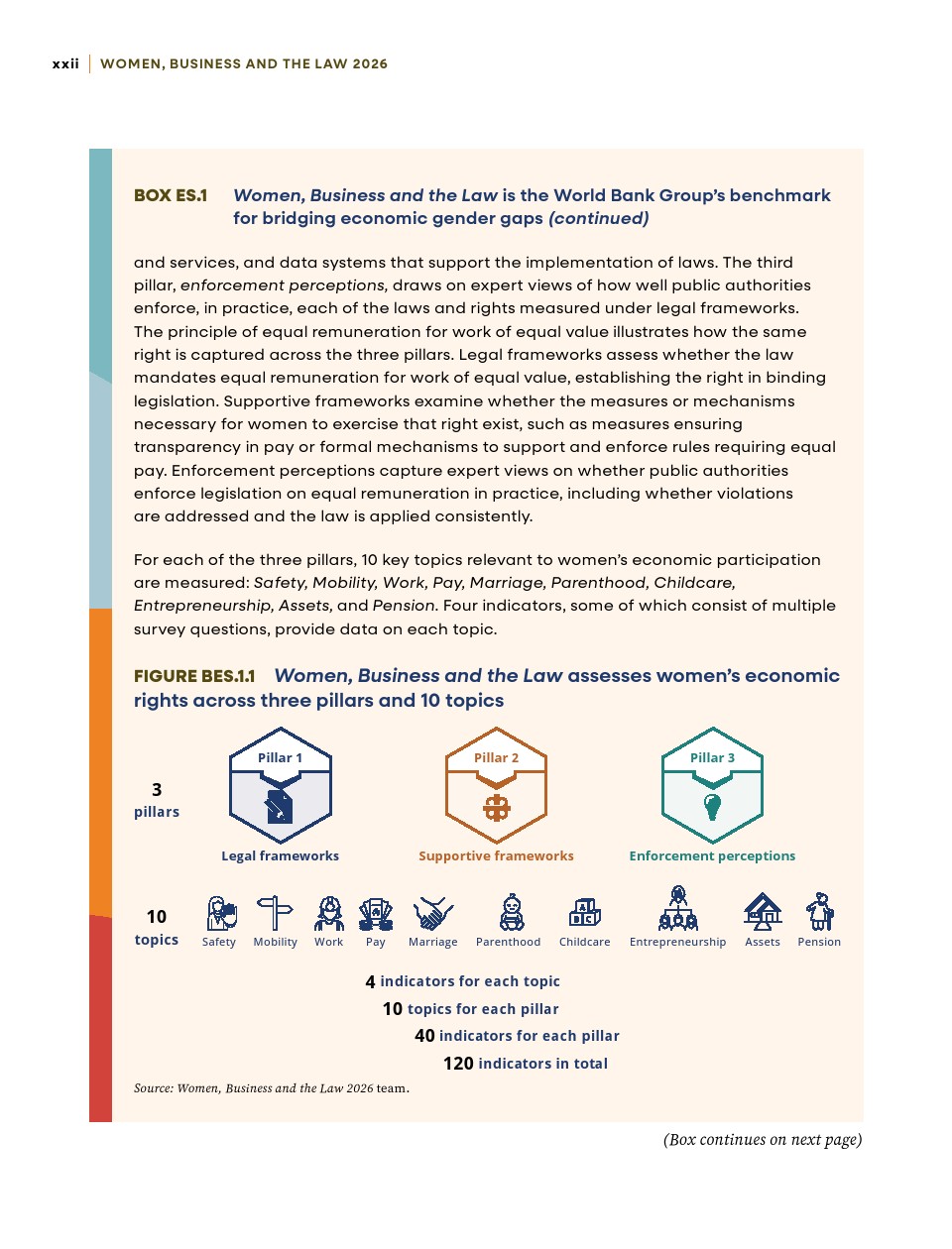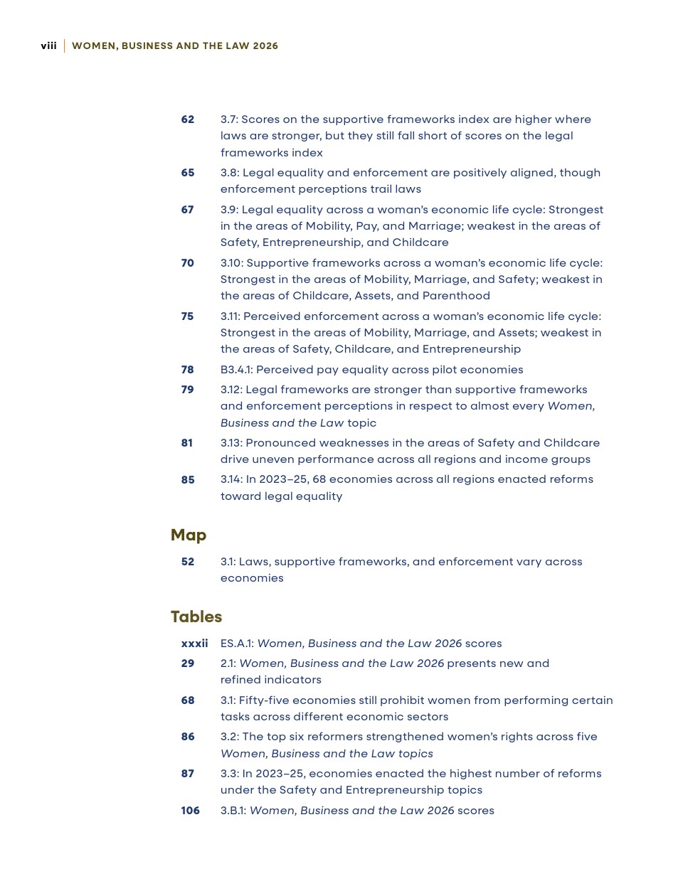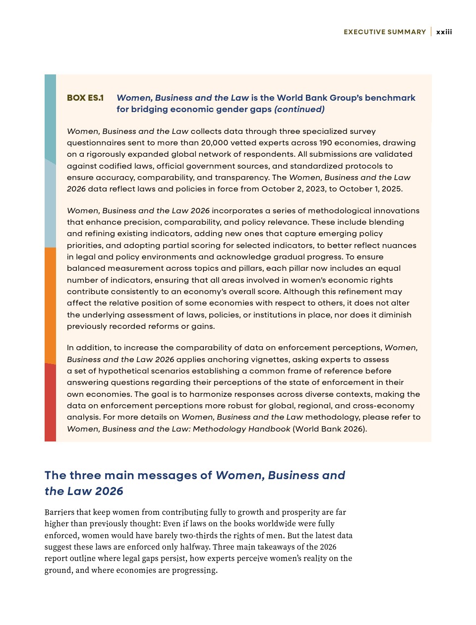 本报告基于190个经济体数据,首次系统性构建法律框架、支持体系与执行感知三大指标体系,对女性经济权利进行量化评估。数据显示,全球女性仅拥有不足三分之二的法定经济权利,接近完全平等的经济体占比不足5%,且尚无任何经济体实现完全法律平权。这一结构性缺口表明,制度性约束仍是限制女性经济参与的核心瓶颈。