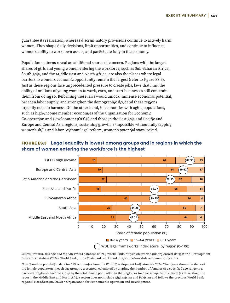 从结构分布看,人口与制度错配问题突出。未来十年全球将新增12亿劳动力,其中一半为女性,但南亚、撒哈拉以南非洲和中东北非等人口增长最快地区,恰恰也是法律限制最严的区域。这种“高人口增长+低制度保障”的组合,显著抑制潜在劳动力供给释放。
