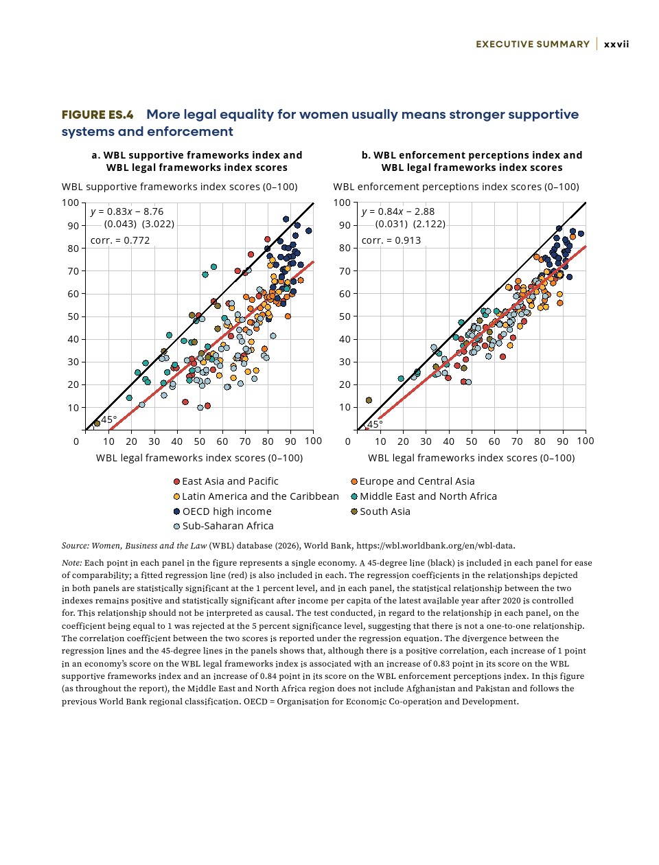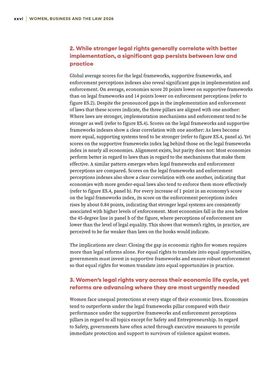 从指标结构看,全球法律框架指数平均为67分,而支持体系与执行感知分别仅为47分和53分,呈现明显“立法领先、执行滞后”的特征。约一半必要政策工具尚未建立,且执法效果普遍低于法律承诺。这种制度断层意味着,即便法律赋权存在,女性在实际经济活动中的权利实现仍高度不确定。