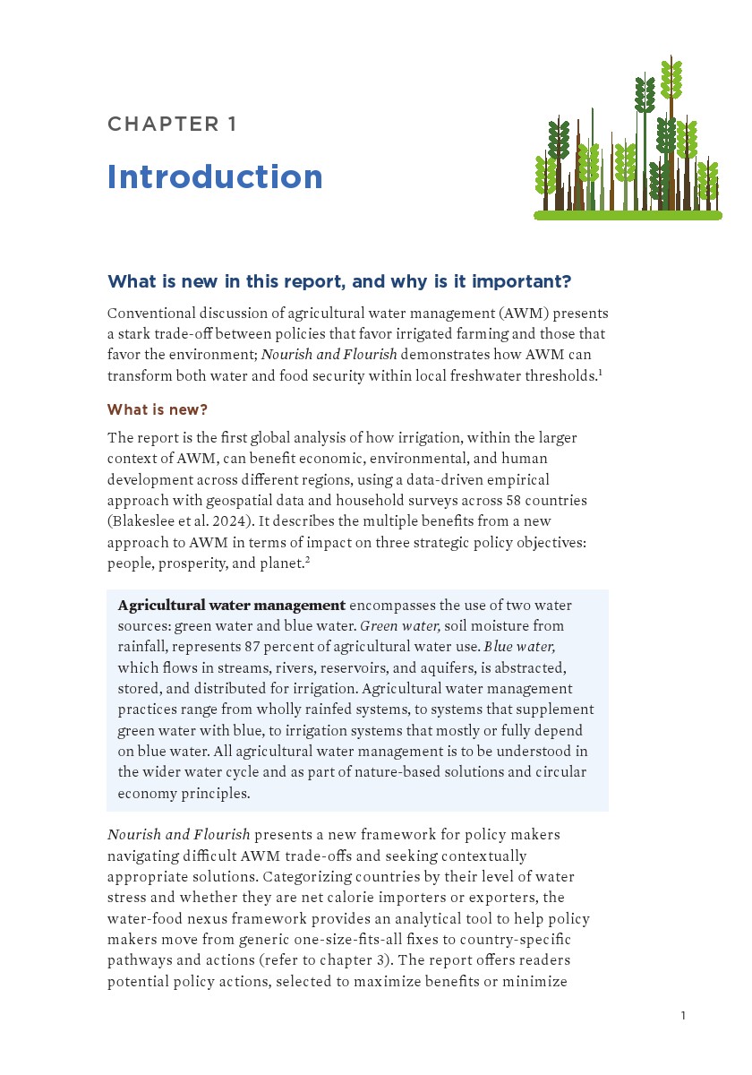 预计2050年,全球需要养活约100亿人口。然而,当前包括农业用水管理实践在内的水和农业食品系统,仅能可持续地养活34亿人。当今的农业用水管理实践导致了水资源利用失衡——既浪费了通过解决过度用水和用水不足来提高水生产力的机会。本报告强调了解决农业用水管理缺陷的紧迫性,同时帮助政策制定者应对与农业用水管理相关的艰难权衡。