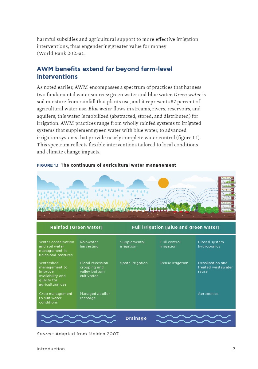 本报告为政策制定者提供了成功农业用水管理政策的实践案例,阐述了实施路径,并提供了利用农业用水管理实现整体经济效益的实用策略。其对农业用水管理融资需求的评估显示,所需资金数额虽然可观,但低于大多数政府在农业支持和补贴方面的当前支出。这一比较突显了有效重新配置现有资源和补贴的机会。