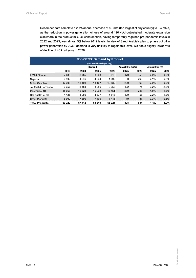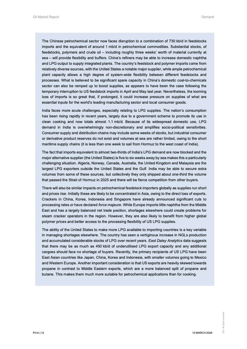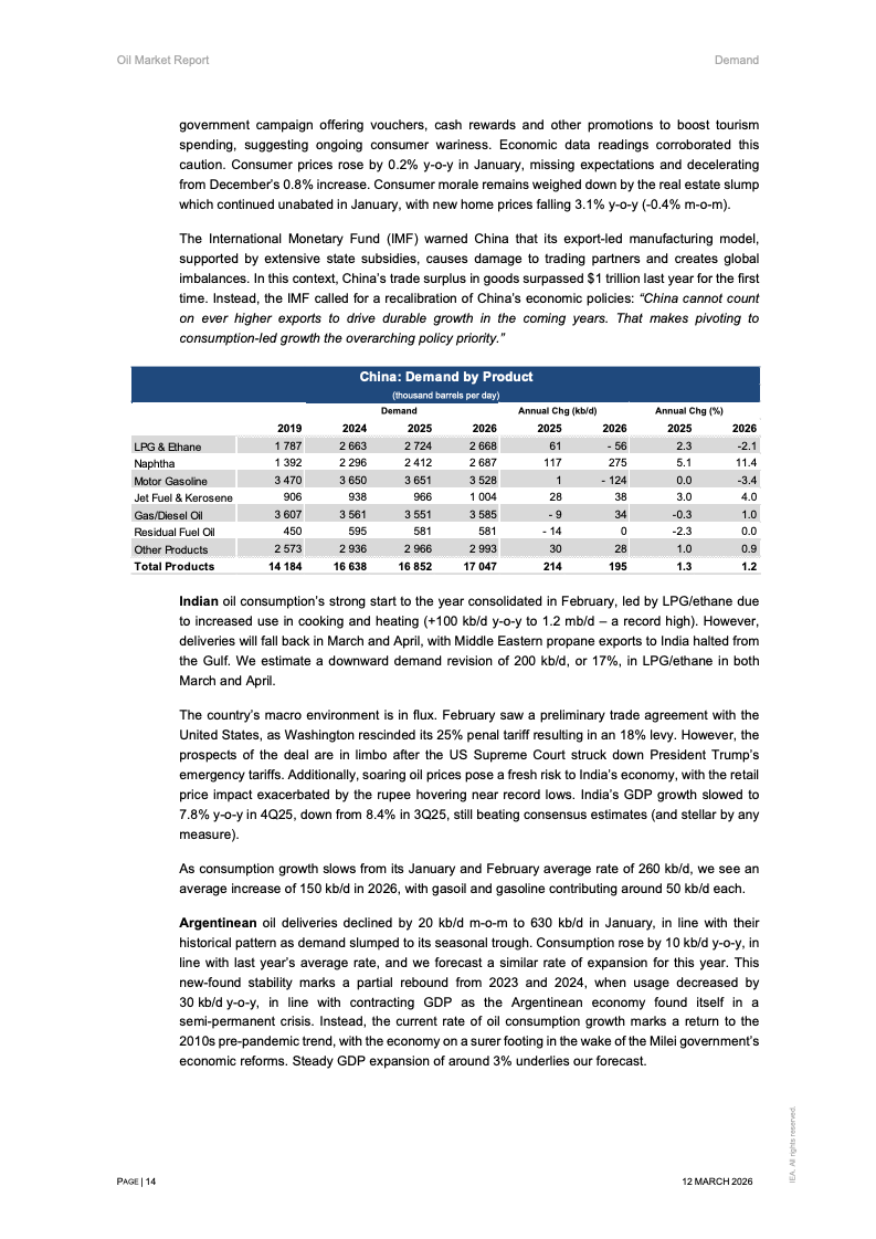 需求端同步走弱,航空运输大规模取消叠加LPG供应链受阻,使3至4月全球石油需求较此前预期下调约100万桶/日 。全年需求增速被压缩至64万桶/日,较此前预测减少21万桶/日,显示需求恢复动能明显减弱 。从结构看,LPG及乙烷需求增速降至15万桶/日,喷气燃料增速降至12万桶/日,能源消费呈现阶段性收缩特征。
