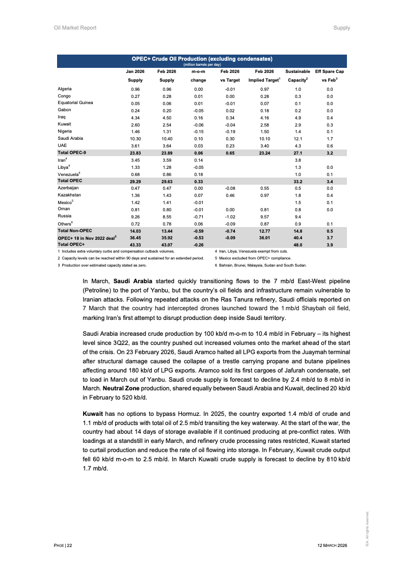 中东冲突正在引发全球石油市场史无前例的供给冲击,霍尔木兹海峡原本约2000万桶/日的运输量几近停滞,占全球约20%的石油流动受阻。在出口渠道受限与库存快速累积的双重压力下,海湾国家被迫削减至少1000万桶/日的原油产量,并叠加凝析油及液化气关停,形成系统性供给收缩 。由此,2026年3月全球石油供应预计环比下降800万桶/日,降至约9880万桶/日,创下自2022年以来的低位。