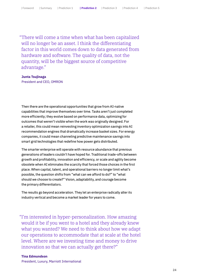 综合来看,2030年的领先企业将呈现出清晰趋势:以AI驱动的生产率释放为资本来源,通过定制化技术体系不断试探新市场,并以高速决策和动态组织应对不确定性。真正的分水岭不在于是否采用AI,而在于企业能否将技术、数据与自身独特业务逻辑持续编码进组织运作之中。未来十年,创新将不再是阶段性项目,而是一种被写入企业“操作系统”的常态能力。