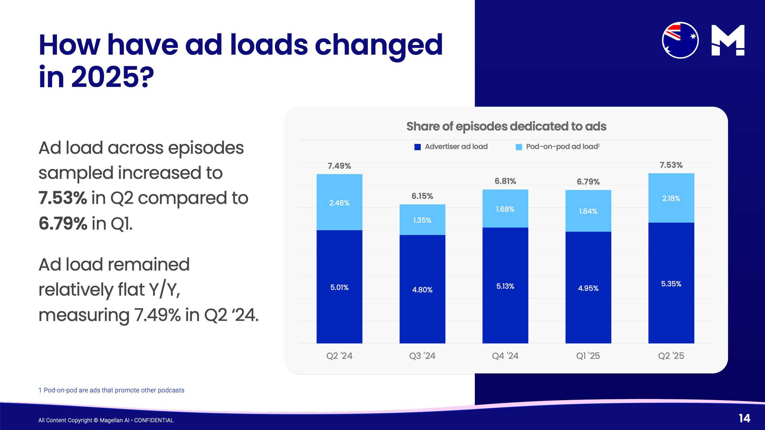 2025年第二季度,澳大利亚播客广告市场延续扩张轨道,呈现出更具韧性的增长结构。基于对超过10,000期播客节目的监测数据,整体广告支出同比增长20%,环比Q1提升23%,且月度投放呈阶梯式上升,从4月的106%逐步攀升至6月的147%。 这一增长并非短期波动,而是广告主预算逐步释放的结果。同时,头部广告主结构保持稳定,前十中有五家延续上一季度席位,反映出市场集中度与头部效应持续强化。