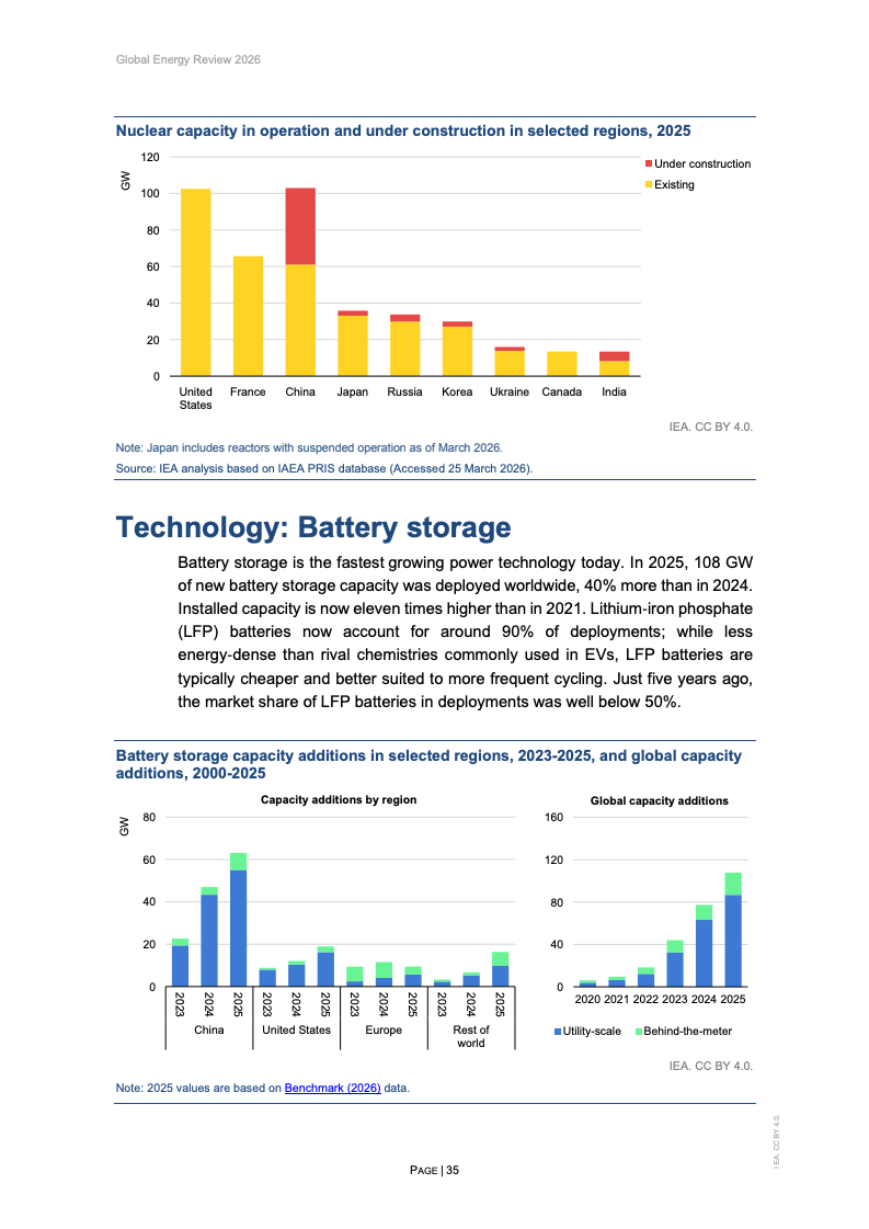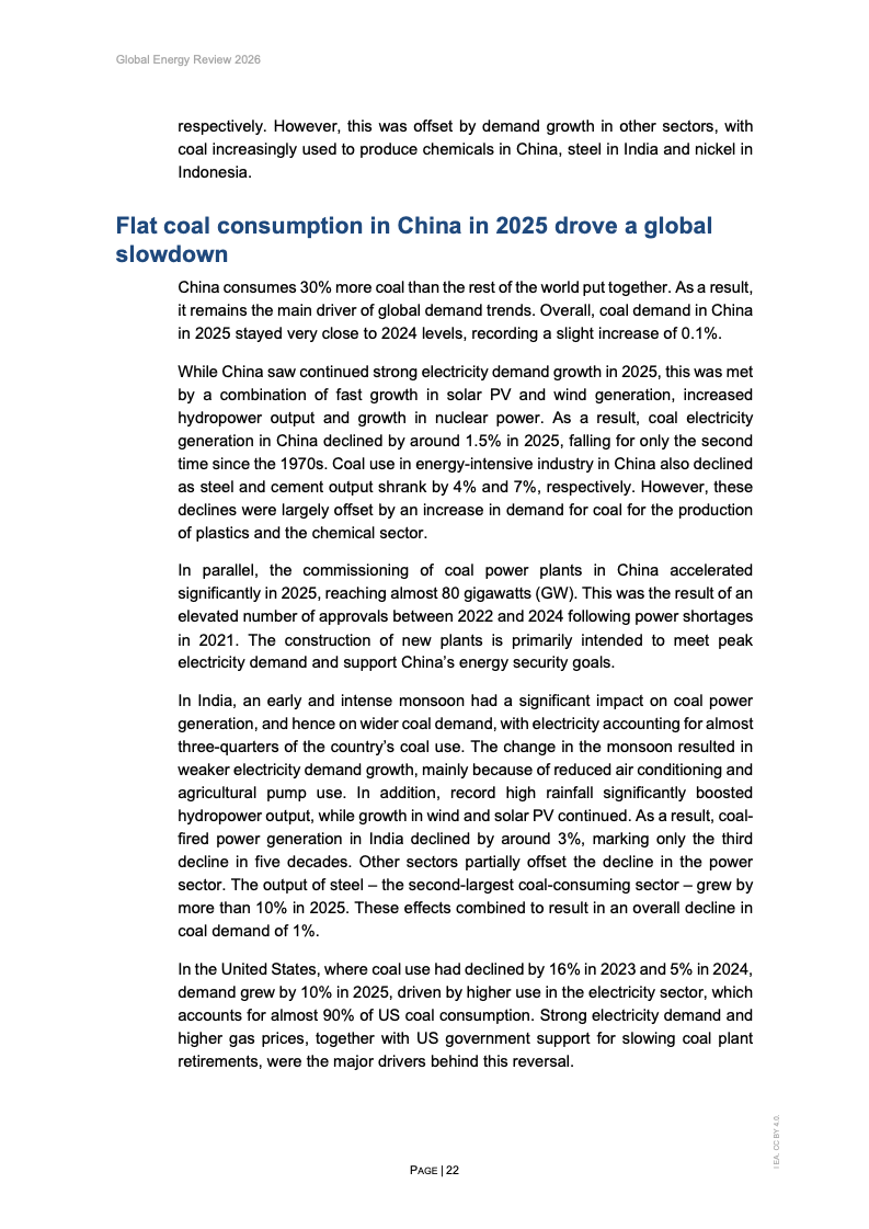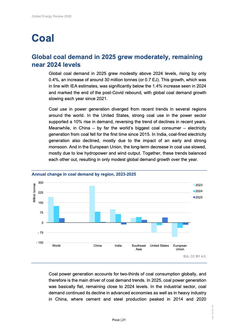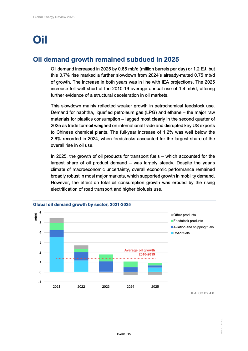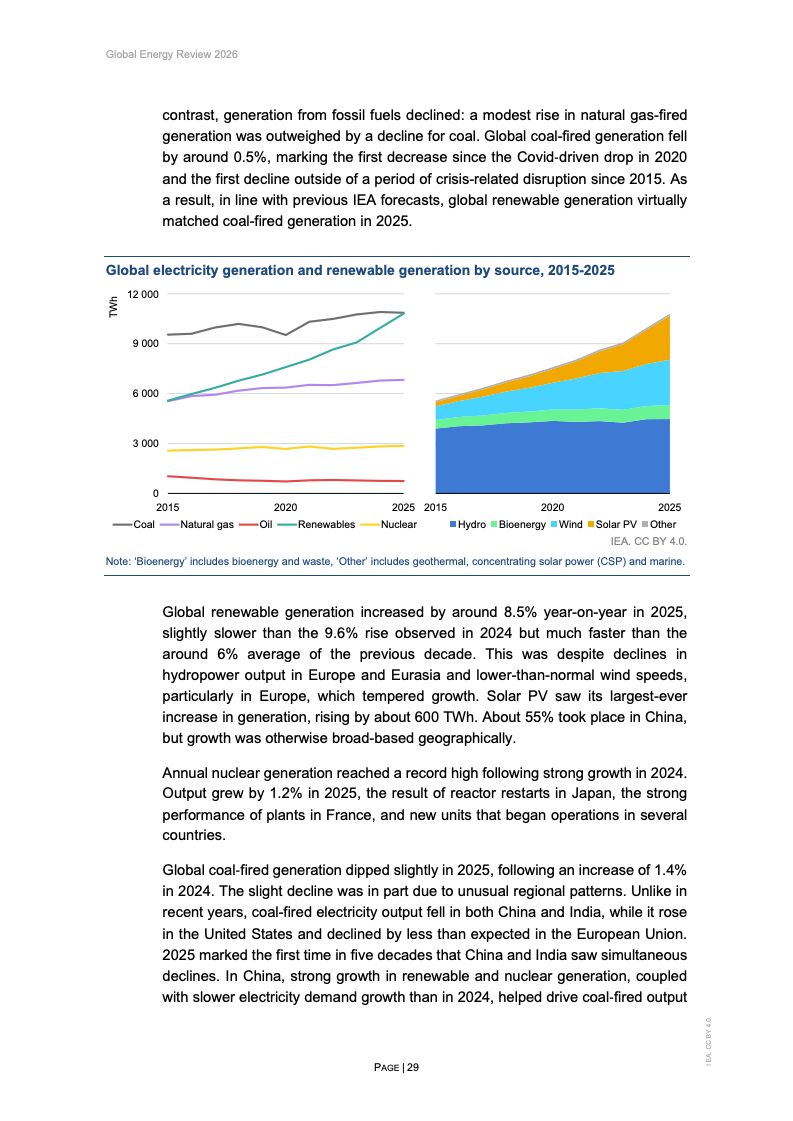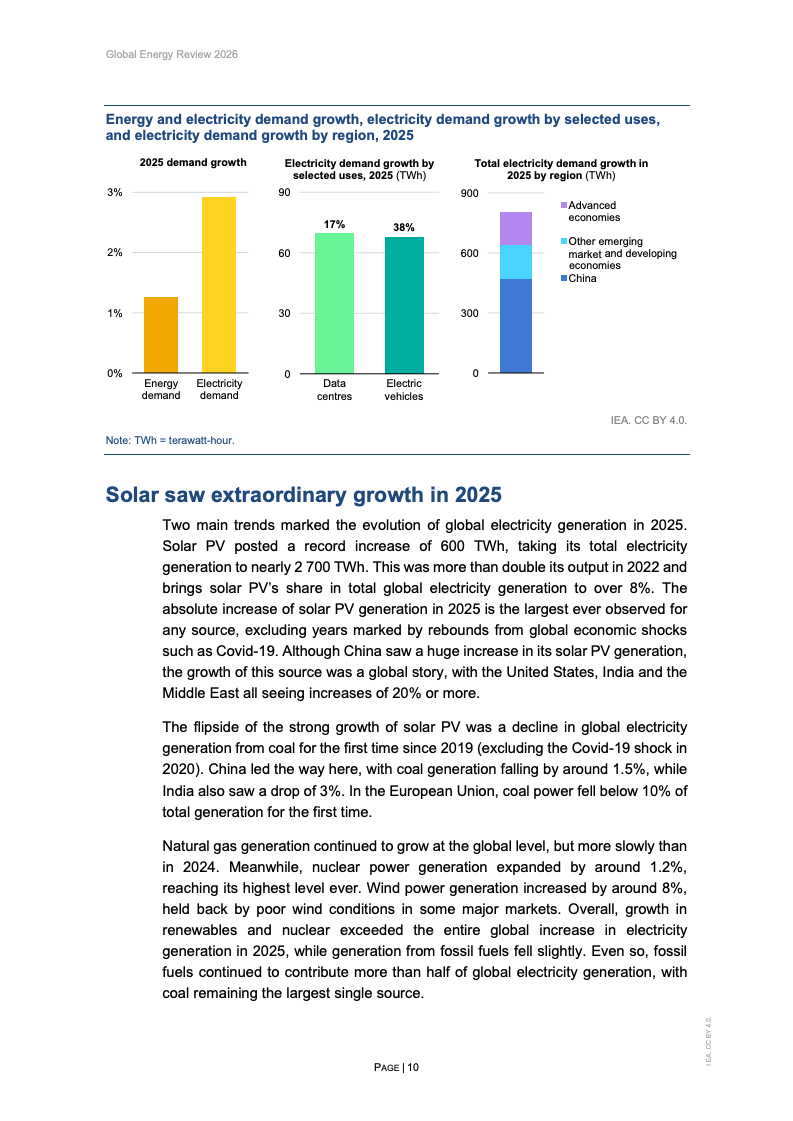 传统化石能源整体进入低速增长通道,石油需求增长0.7%,显著低于2010至2019年1.4mb/d的平均水平,交通领域需求被电动车渗透率快速提升所抑制,2025年全球电动车销量超过2000万辆,占新车销量约四分之一;天然气需求增长约1%,较2024年的2.8%明显放缓,高价格与工业疲弱共同压制需求;煤炭需求仅增长0.4%,中国与印度电力端需求下降基本抵消美国因气价上升带来的阶段性反弹,整体呈现平台期特征。