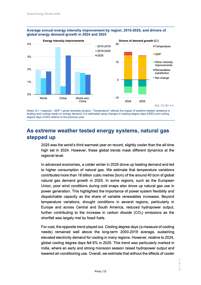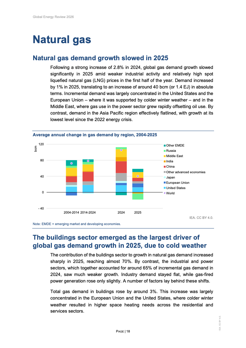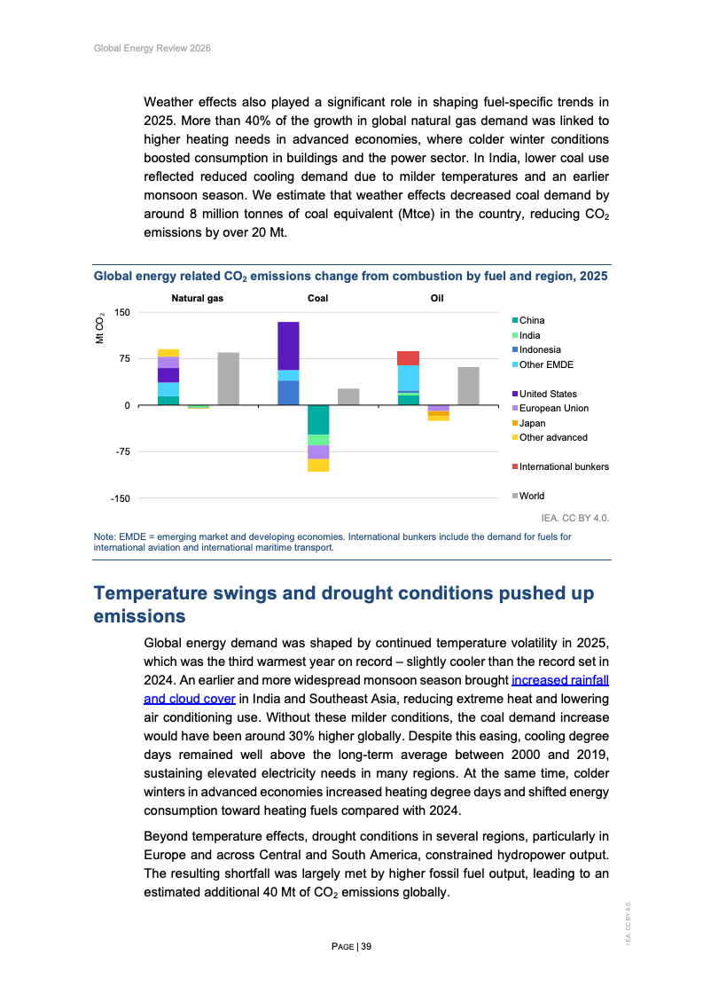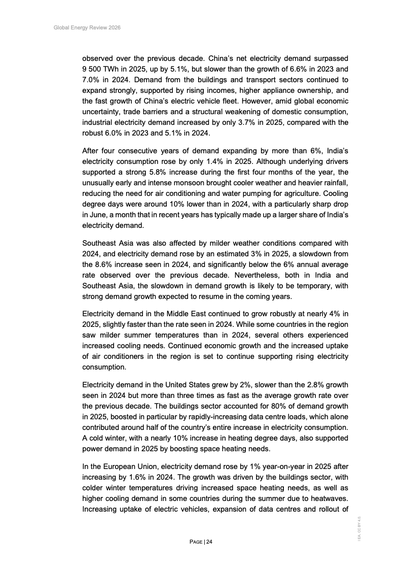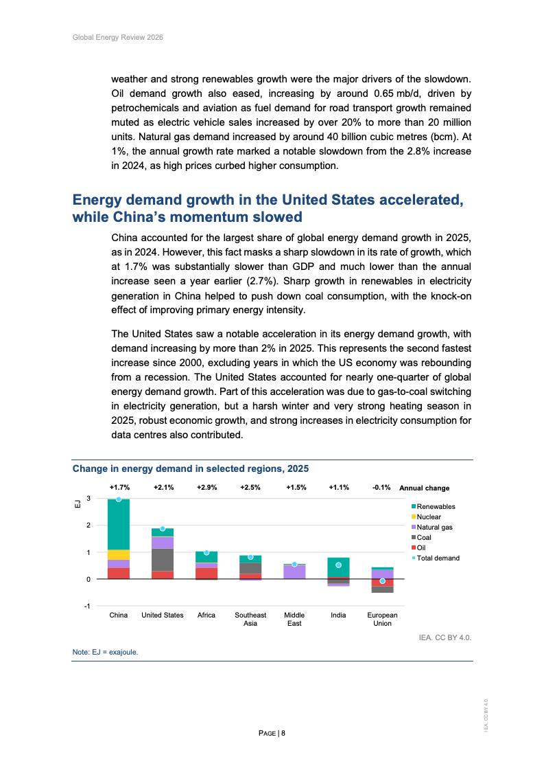 区域格局方面,全球能源需求呈现明显分化,中国仍是最大增量来源,但增速降至1.7%,显著低于此前水平,反映出可再生能源替代加速与能源强度改善;美国需求增长超过2%,创近二十年来高位之一,主要受寒冬、工业韧性及数据中心用电推动;印度需求仅增长约1%,受强季风与降温影响明显,而欧盟则因风电与水电出力不足转向天然气,显示在高比例可再生能源体系下,气候波动对能源结构的短期扰动仍然显著。