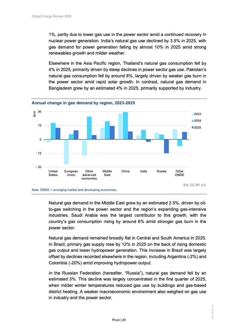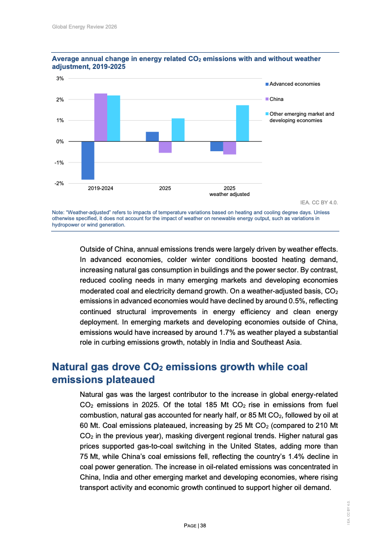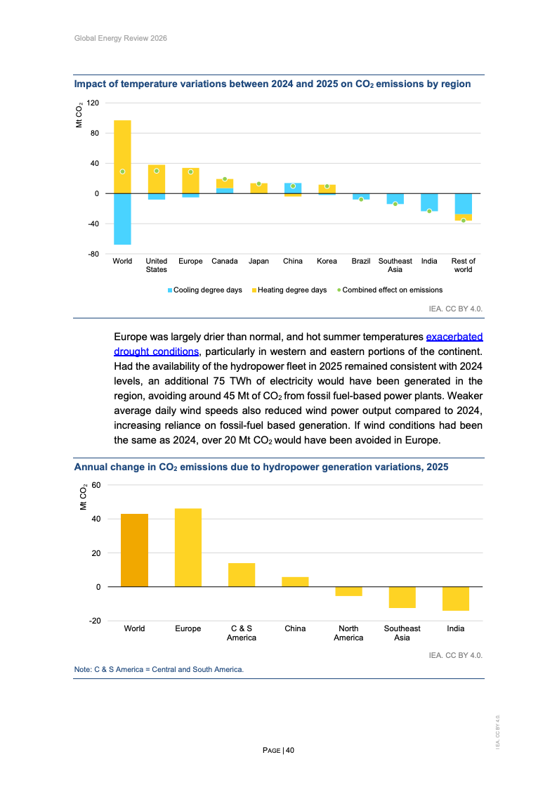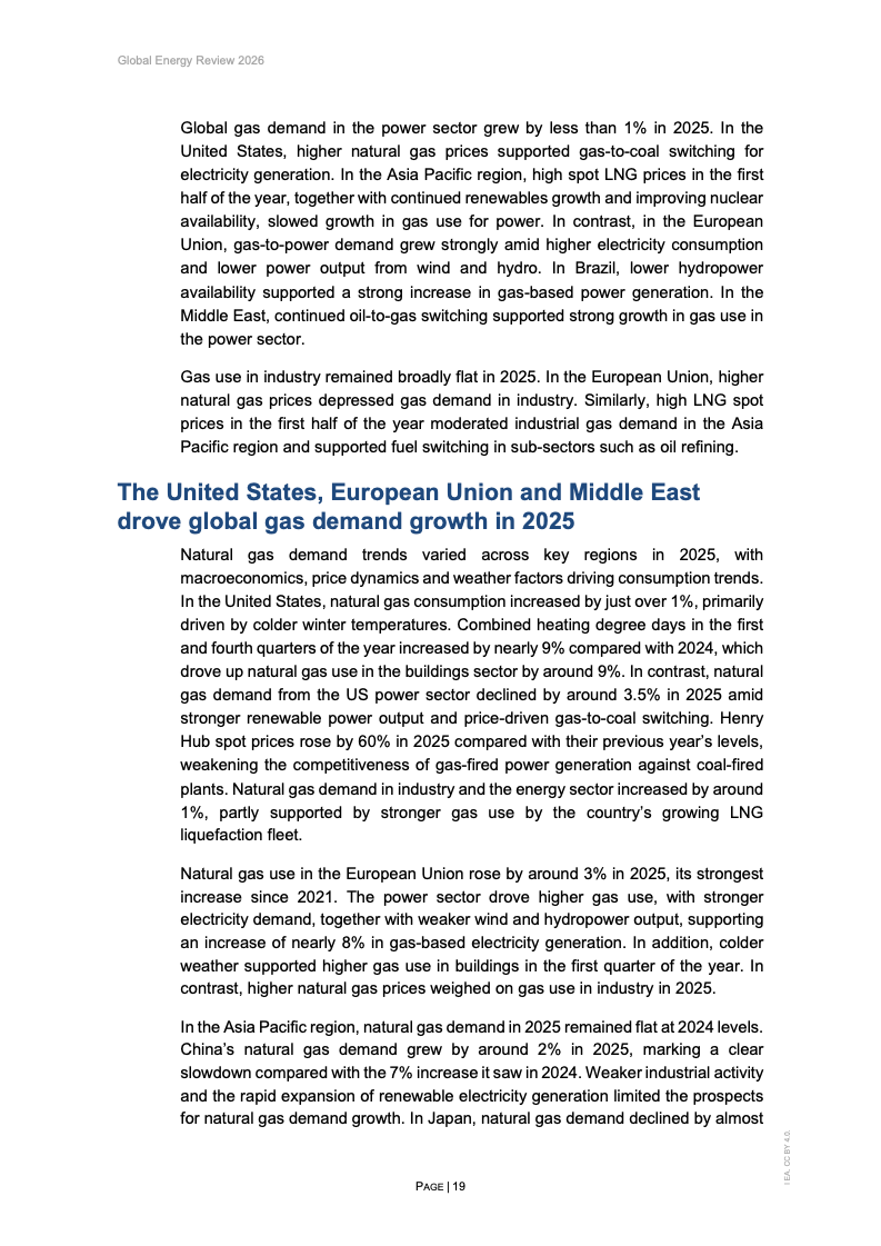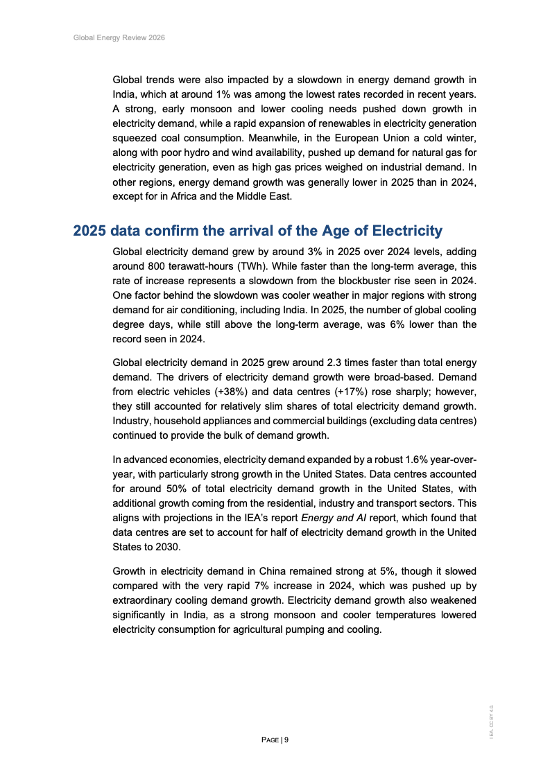 区域格局方面,全球能源需求呈现明显分化,中国仍是最大增量来源,但增速降至1.7%,显著低于此前水平,反映出可再生能源替代加速与能源强度改善;美国需求增长超过2%,创近二十年来高位之一,主要受寒冬、工业韧性及数据中心用电推动;印度需求仅增长约1%,受强季风与降温影响明显,而欧盟则因风电与水电出力不足转向天然气,显示在高比例可再生能源体系下,气候波动对能源结构的短期扰动仍然显著。