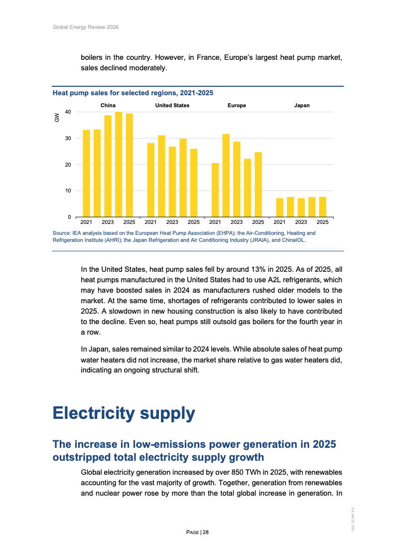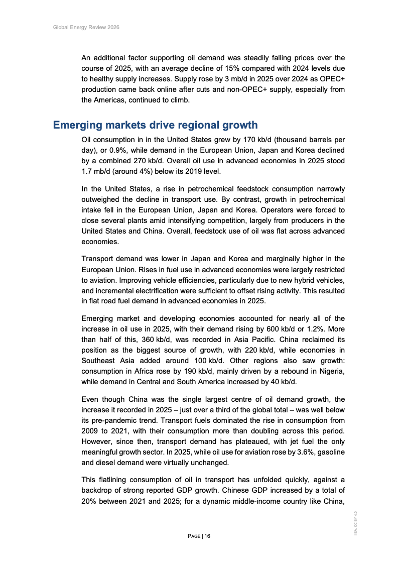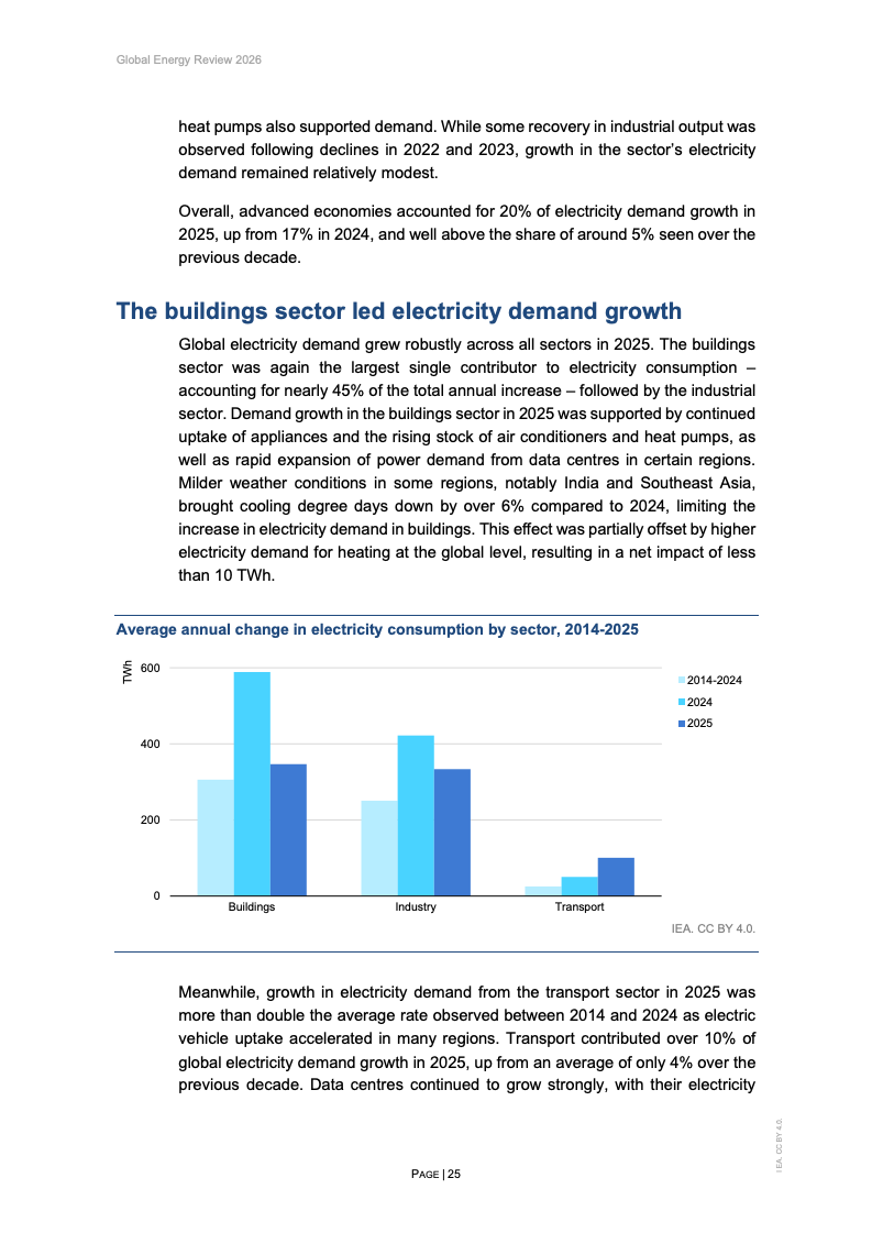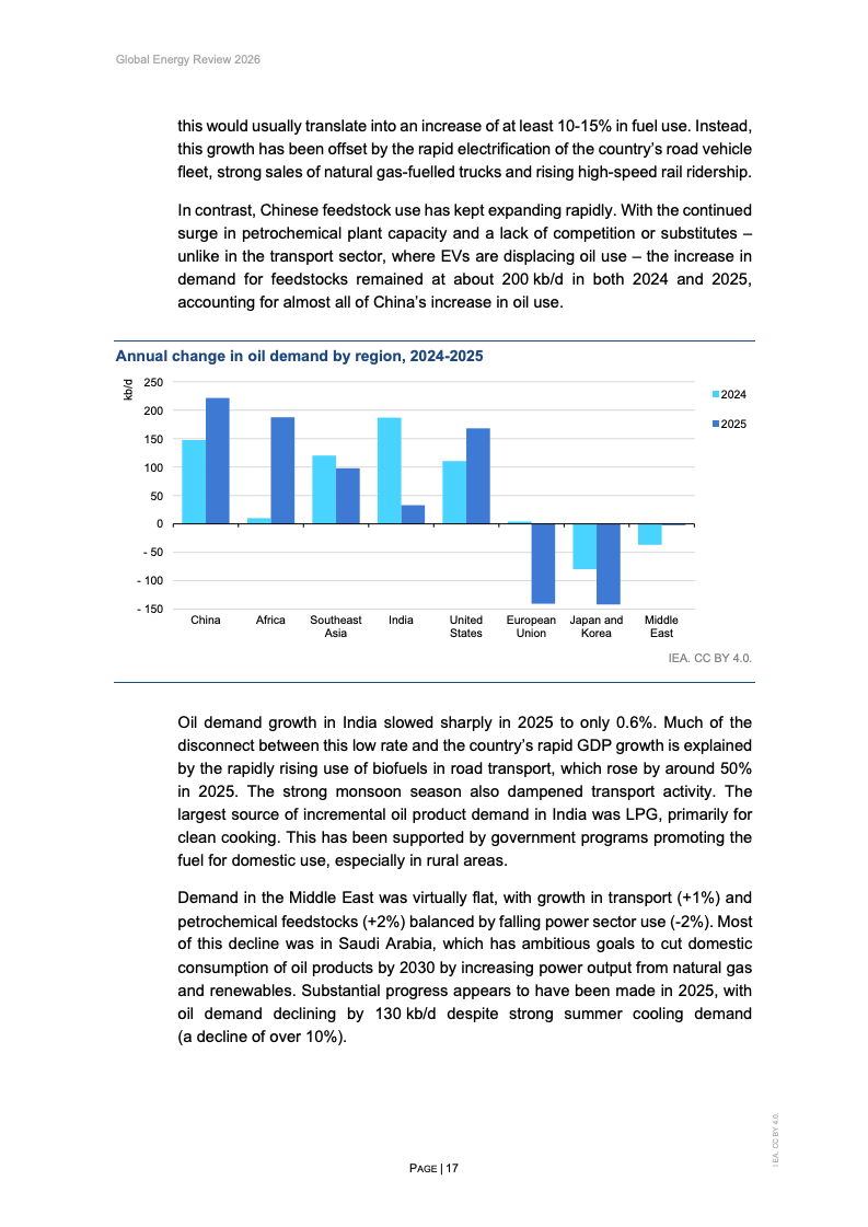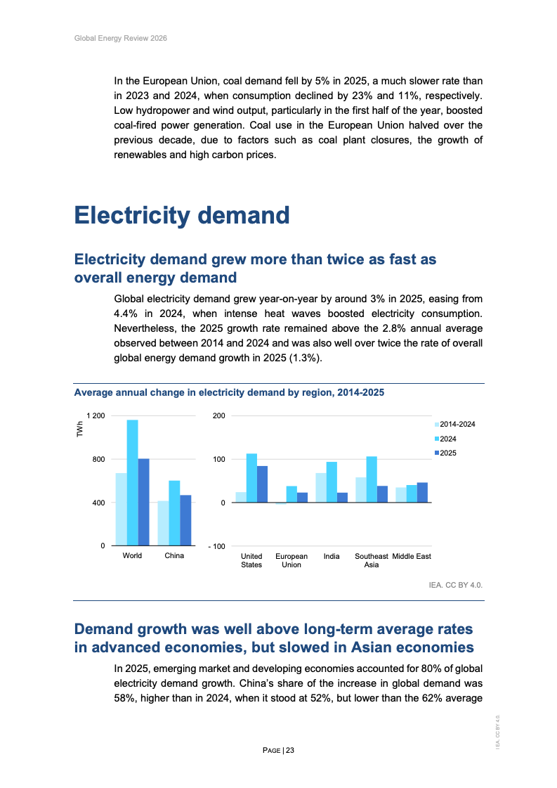 区域格局方面,全球能源需求呈现明显分化,中国仍是最大增量来源,但增速降至1.7%,显著低于此前水平,反映出可再生能源替代加速与能源强度改善;美国需求增长超过2%,创近二十年来高位之一,主要受寒冬、工业韧性及数据中心用电推动;印度需求仅增长约1%,受强季风与降温影响明显,而欧盟则因风电与水电出力不足转向天然气,显示在高比例可再生能源体系下,气候波动对能源结构的短期扰动仍然显著。
