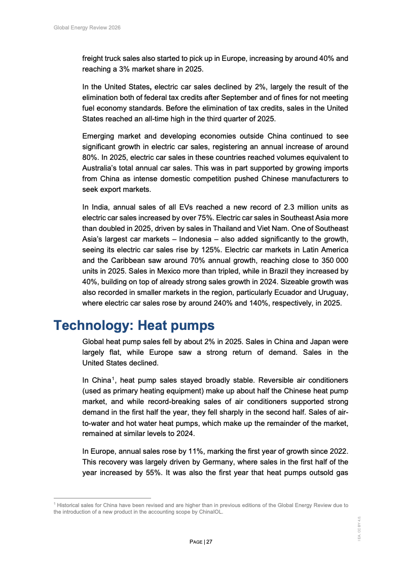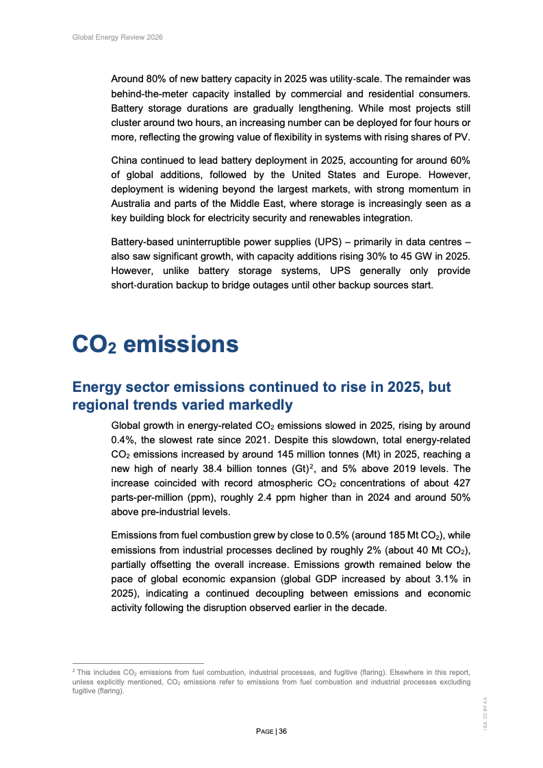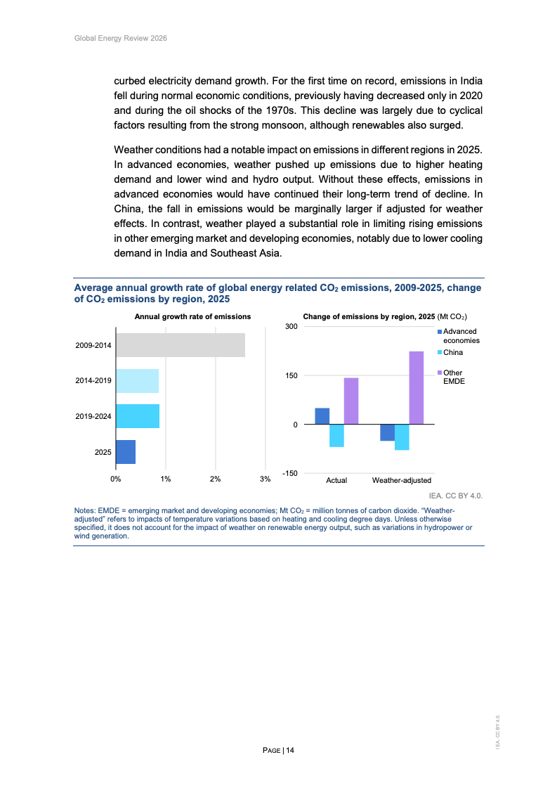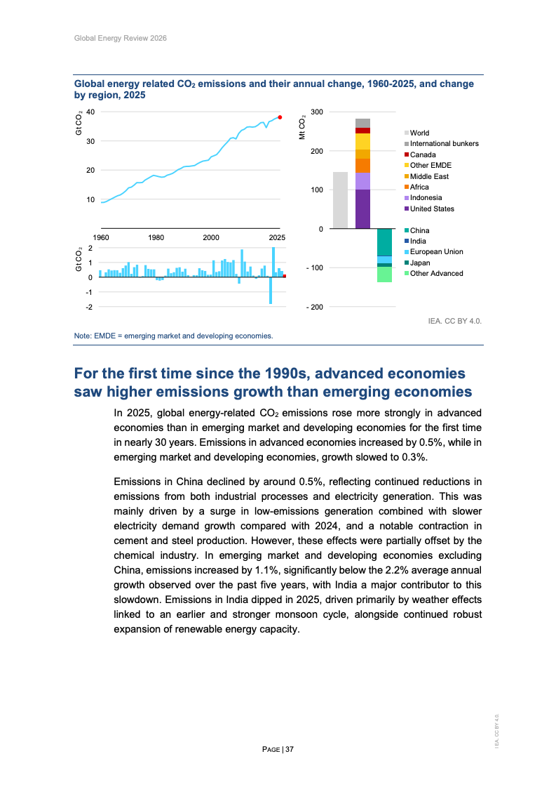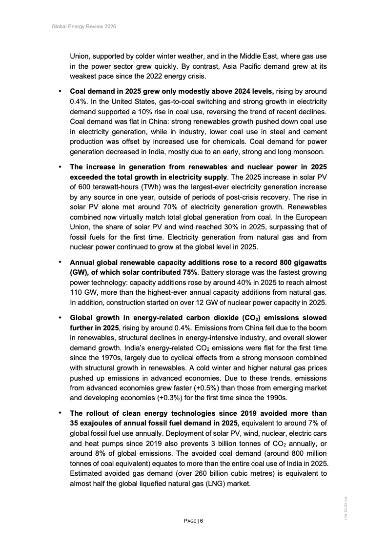 在排放层面,全球能源相关二氧化碳排放增长0.4%,总量仍突破380亿吨创历史新高,但增速持续放缓;中国排放下降约0.5%,印度首次实现零增长,而发达经济体排放反而上升0.5%,主要受寒冷天气与能源结构波动影响;值得注意的是,自2019年以来清洁能源部署已累计避免约35艾焦化石能源需求,并减少约30亿吨排放,相当于全球约7%至8%的规模,显示技术扩散已开始产生实质性减排效果。