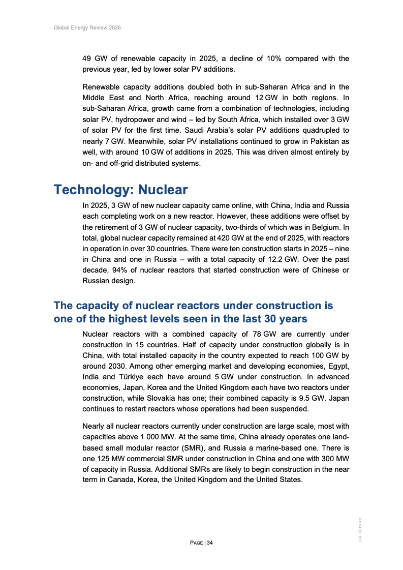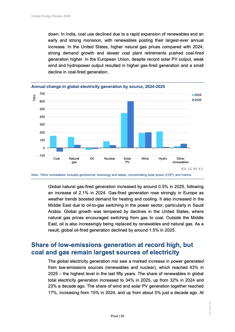供给侧的变化进一步强化了结构性转型趋势,2025年光伏发电增加600TWh,为历史最大年度增量,单一来源贡献约70%的电力增长;可再生能源与核电新增发电量已超过全部电力需求增量,意味着化石能源发电在总量上开始被挤出,全球低排放电力占比升至43%,创近五十年新高,尽管煤电仍占34%、天然气占21%,但能源系统的重心正在加速向低碳电力迁移。
