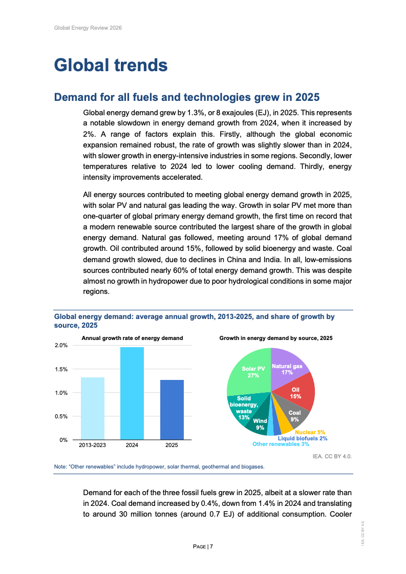 2025年全球能源市场呈现出由周期驱动向结构驱动转变的关键特征,能源需求增长降至1.3%,较2024年的2%明显回落,增量约8艾焦;这一放缓并非需求疲弱的简单体现,而是由经济增速从3.3%降至3.1%、高耗能产业扩张趋缓、气温回落抑制制冷需求以及能源强度改善接近2%共同作用的结果,尤其是效率提升显著高于2019至2024年1.3%的平均水平,成为压制需求增长的核心变量,标志着全球能源消费正逐步脱离对粗放增长的依赖,进入以效率与结构优化为主导的新阶段。