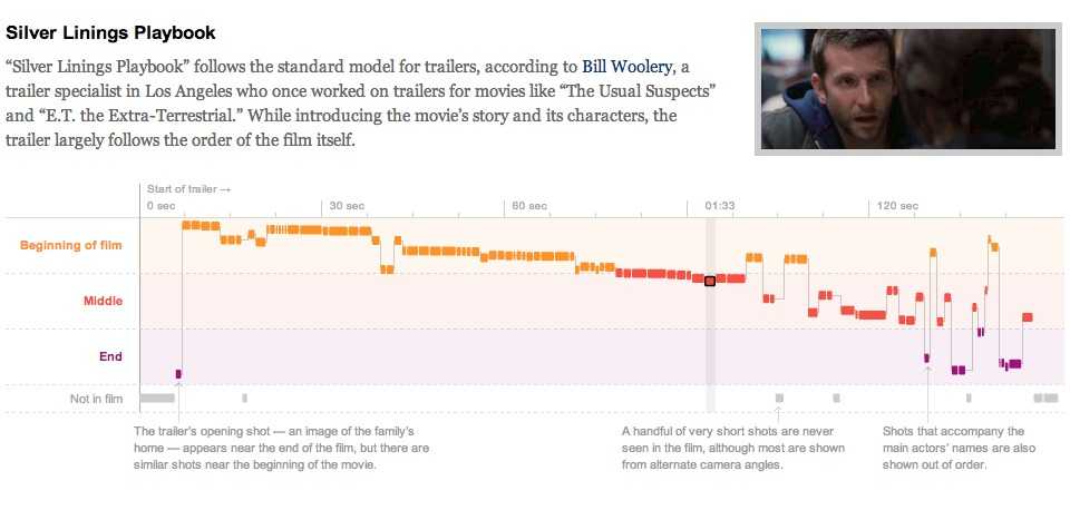 介绍:2013年奥斯卡奖颁奖之前,纽约时报对5部获得最佳影片提名电影的预告片进行了可视化分析。通过对比预告片与整片镜头的位置、时长,来观察每部电影是如何用预告片来推销自己的: