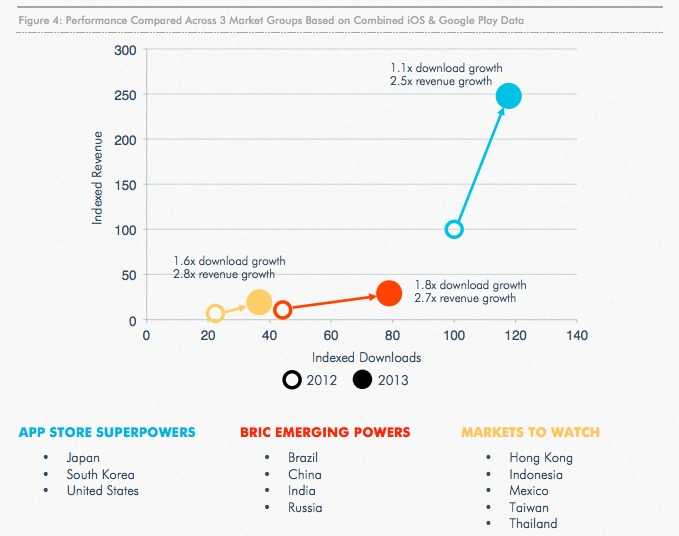3、在 2013 年抢眼的不止这几个国家,还有包括中国在内的金砖四国(BRIC:巴西、俄罗斯、印度、中国),App Annie 将这四个国家的应用商店的成长情况放在一起来算,发现日本、南韩、美国三国在 2013 年有 1 倍的下载增长和 5 倍的收入增长(iOS+Google Play),而 BRIC 则在这一年有 8 倍的下载增长和 7 倍的收入增长(题外,话说中国市场如果不是用 Google Play 衡量应该更可观)。另外 5 个地区(香港、台湾、墨西哥、印度尼西亚、泰国)的市场增长情况也好看,在下载上有 6 倍增长,收入有 8 倍的增长,App Annie 看好这五个地区在 2014 年的表现。