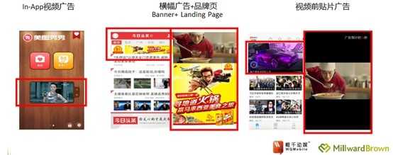 MillwardBrown研究发现,In-App移动视频广告、App横幅广告(Banner)+ 品牌页(Landing page)、视频前贴片广告三种移动广告形式在广告信息回忆度、广告行为影响方面都有很好的表现。其中,品牌页由于创意形式和承载信息方面的优势,会领先其他两种广告形式。