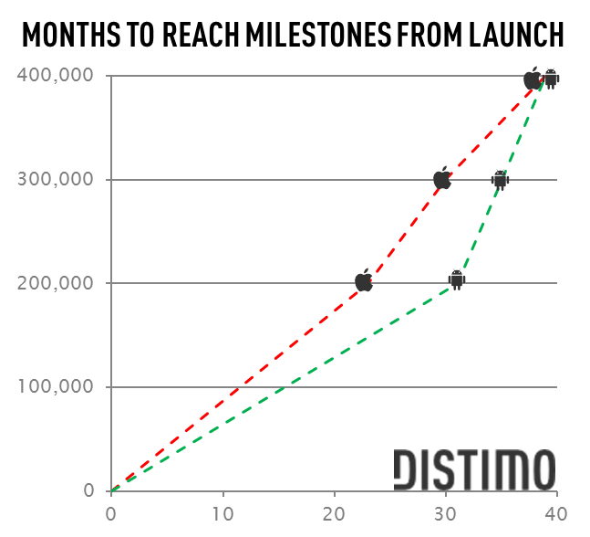 按现在的发展速度来看,安卓市场赶超苹果App Sotre只是时间问题。App store在2011年6月,达到40万的应用规模。下面这张图非常有趣地为我们回顾了安卓赶超iphone商店的历程,看来非常快就可以看到安卓市场赶超iPhone应用商店了。