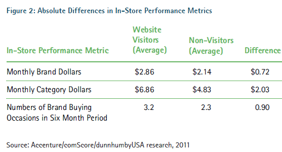 根据 comScore, Accenture,和dunnhumbyUSA联合发布的报告,访问CPG品牌网站的用户在零售商店购买的商品花费比那些没有访问站点的用户高37%。CPG品牌网站访客也是品牌产品目录的更为重度的购买者,在该类目上他们相比非网站访客要高53%。