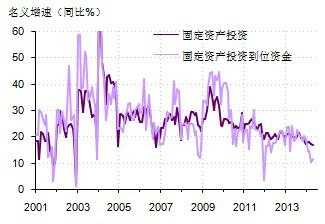 社会融资增速的放缓已经带来了实体经济融资瓶颈的明显收紧。图中深色线是固定资产投资同比增速。浅色线是固定资产投资到位资金同比增速。