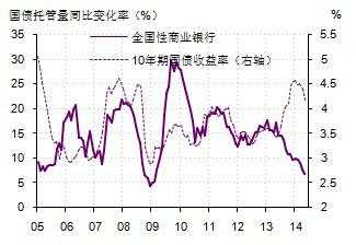 这张图画的是全国性商业银行(就是大银行)国债持有量的同比增速(深色线)。数据来自中债登。浅色线是10年期国债收益率。