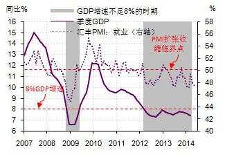从这张图可以看到,凡是GDP增速低于8%的时候,雇员指数都在50以下的收缩区间。这意味着GDP不到8%,就业市场就面临潜在压力。而目前,雇员分项指数处在深度收缩区间。