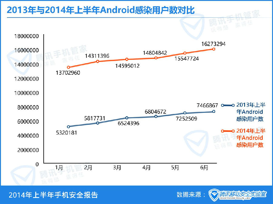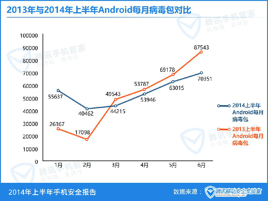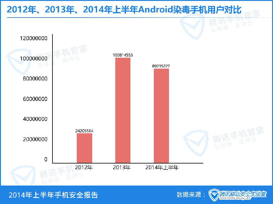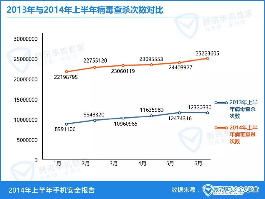 2014年上半年腾讯手机管家为用户查杀Android病毒次数是2013年上半年的2.12倍,同比增长112%。