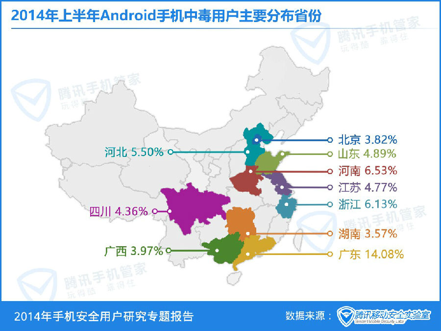 2014年上半年Android手机染毒用户主要分布省份