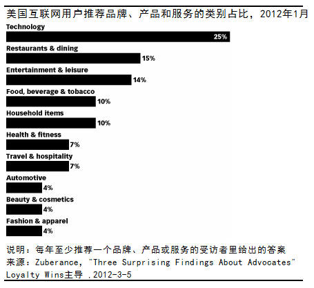 当用户每月至少有一次推荐时,他们可以被认为是品牌的拥护者了。在2012年1月的报告国。68%的这些互联网用户便在此行列中。许多这些品牌拥护者推荐更加频繁,他们推荐品牌的频率以每周或每天算