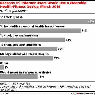 消费者表示使用移动保健应用来保持身材,许多业内人士认为可穿戴设备就是下一步。2014年3月Makovsky Health和Kelton Research的调查发现受众对医疗保健可穿戴设备最感兴趣:81%的美国网民表示他们会使用。跟踪健身是最主要的原因,48%的人选择这项。保持个人健康排在第二位,跟踪饮食和营养排在第三位。
