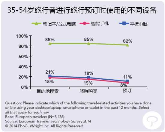 尽管移动渠道逐渐增长,但在欧洲PC电脑仍主导在线旅游预订。过去12个月中,超过80%的休闲旅行者使用笔记本电脑或台式电脑搜索旅游目的地、购买旅游产品或进行预订。