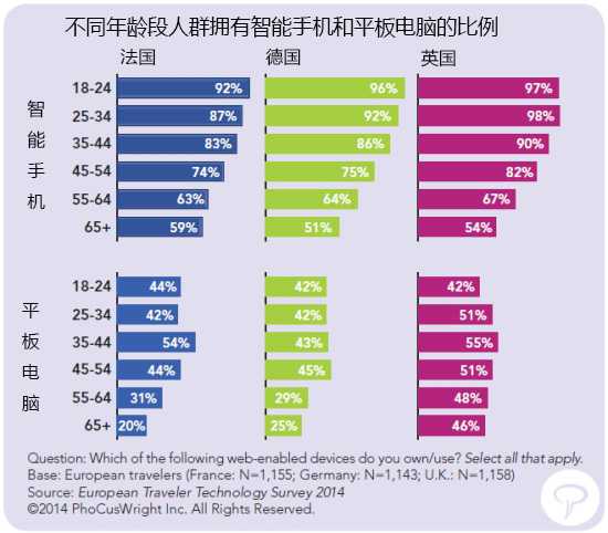 欧洲的休闲旅行者中越来越多技术迷,平均每人拥有3.2部不同的设备,4/5的人拥有笔记本电脑、智能手机和平板电脑。