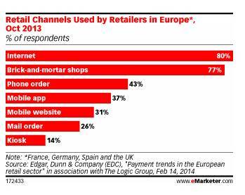 零售商显然已经适应了压力。在2013年10月的一项调查中发现,超过四分之三的零售商在法国、德国、西班牙和英国已经通过互联网和实体店出售商品,但不到40%是通过APP或网站。