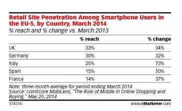 根据comScore MobiLens统计,2014年1月至3月之间,智能手机用户在欧盟访问零售网站占42%,比去年同期增长24%。尽管电商的发展受到多年经济低迷的影响,在零售网站访问量年增长率为分别为50%和73%。