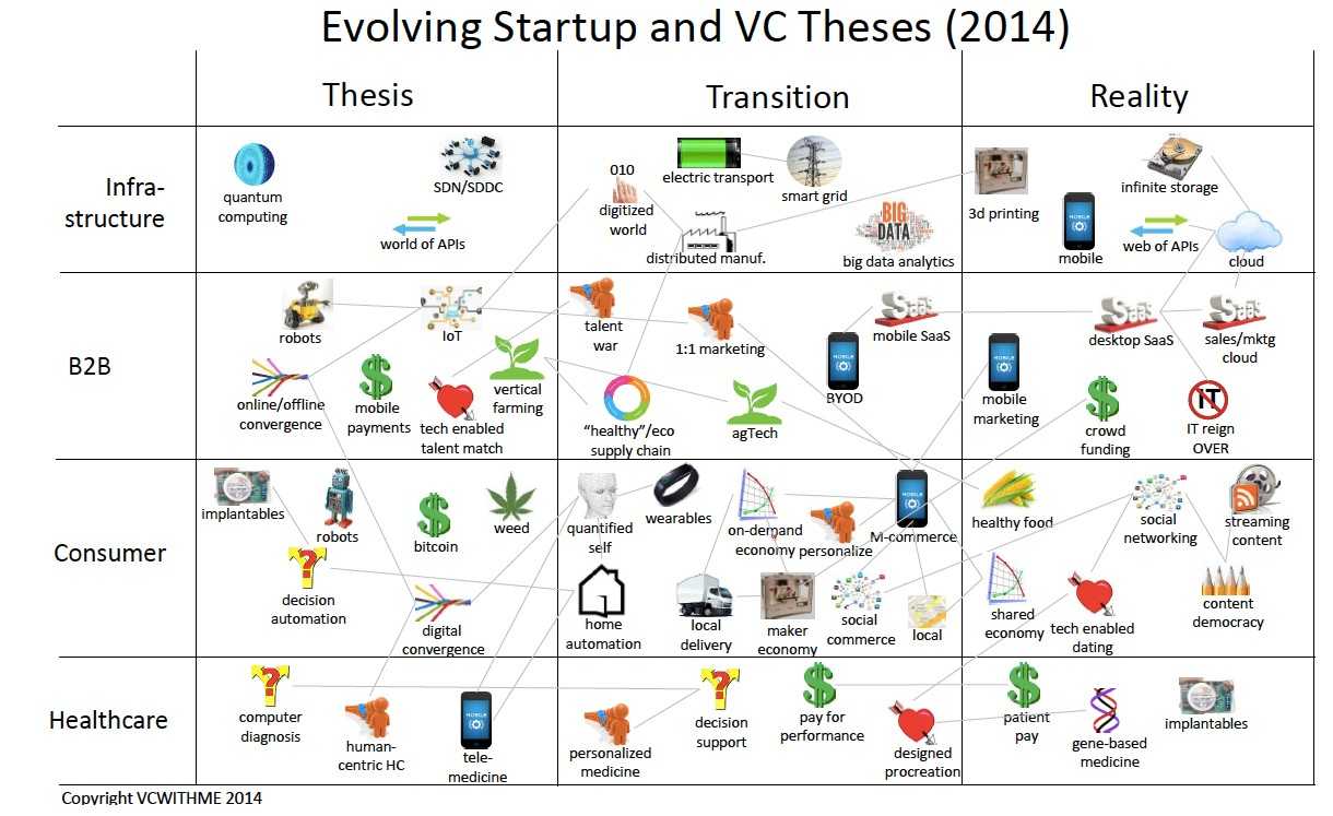 从左到右的水平分类,则表示了近来创业公司与风投的关注焦点——依照「理论」、「转变」、「现实」来区分。
